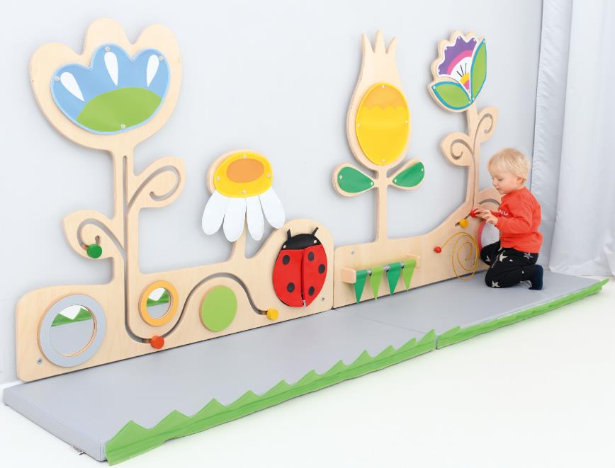 Sensorische speelwand met bloemen thema,spiegels en een draaiend wiel in verschillende kleuren voor visuele en auditieve stimulering.