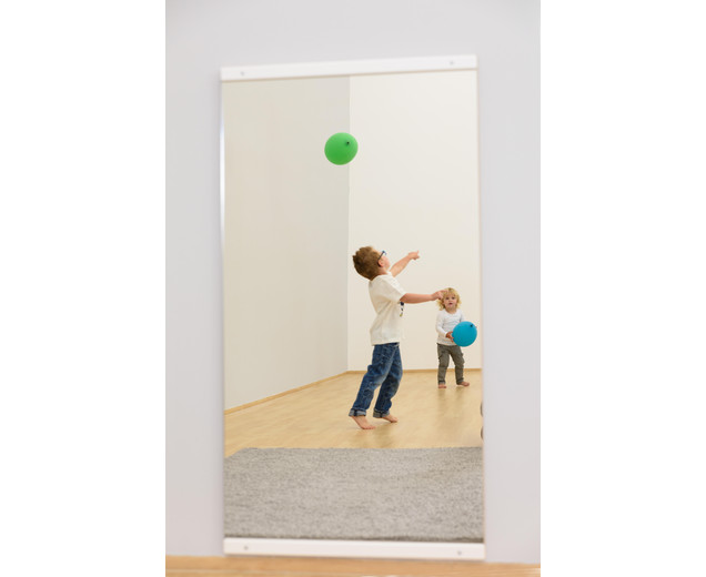In de extra grote spiegel kunnen de kinderen hun hele lichaam en een groot deel van de omgeving zien.