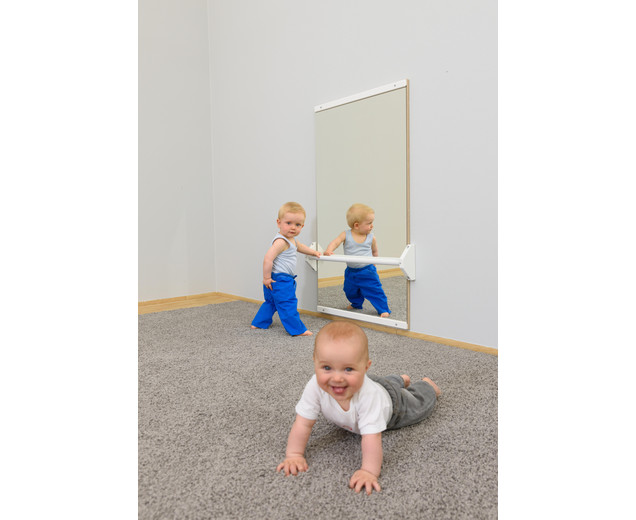 De spiegelwand met loopstang is ideaal voor kinderen die leren lopen of achter zijn in hun motoriek.