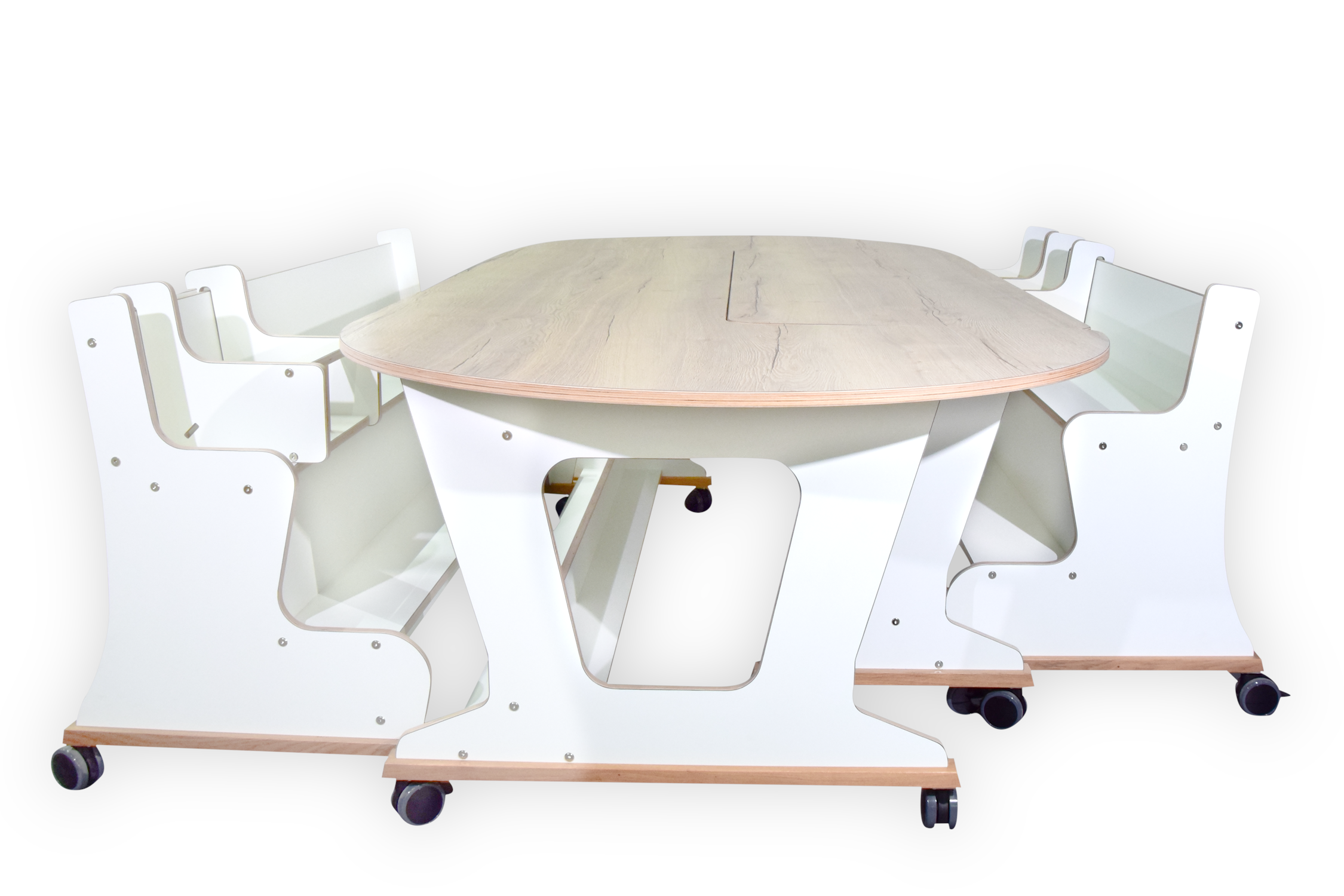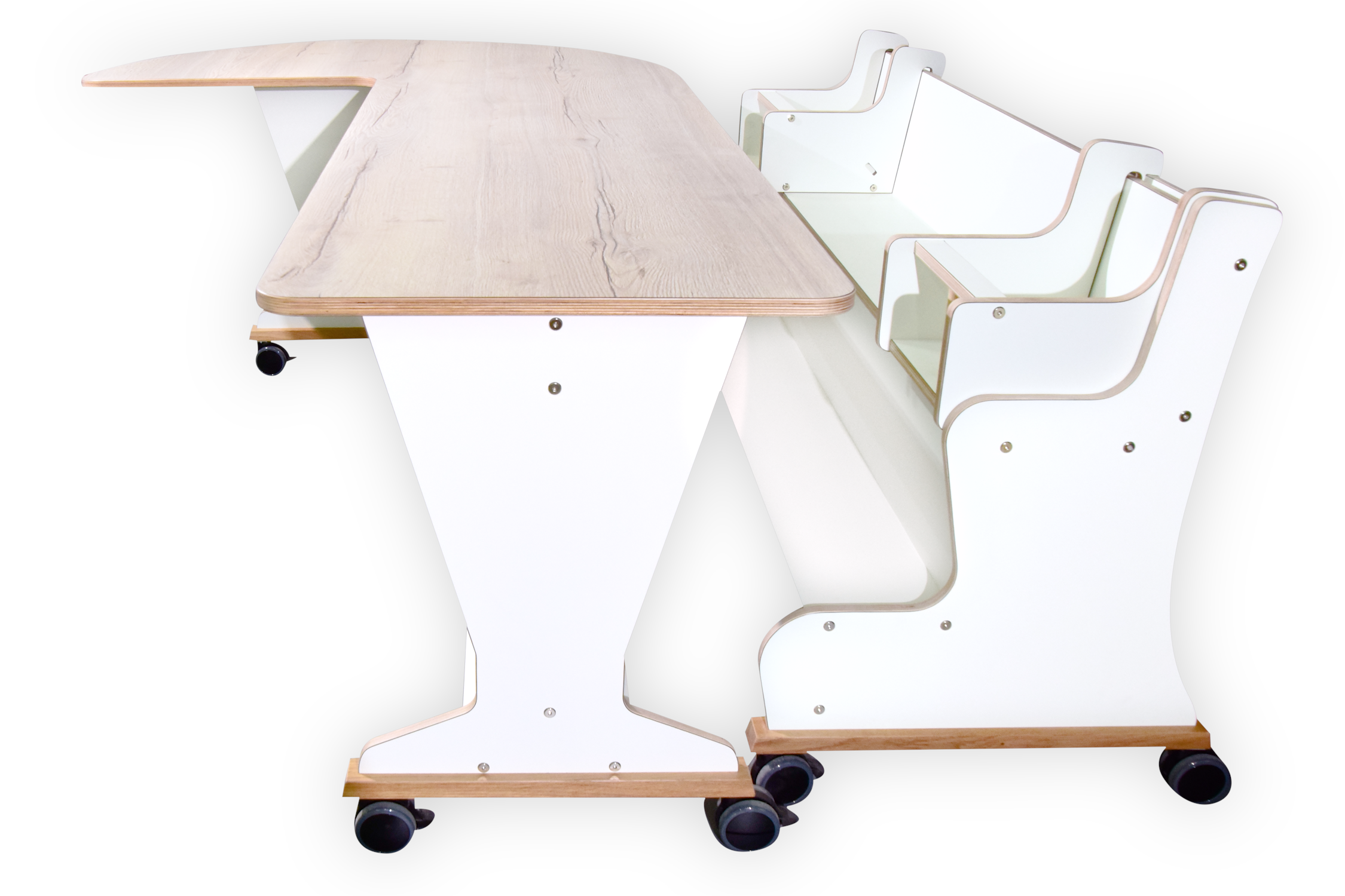 De tafels en banken zijn opgebouwd uit 18mm berken multiplex met witte hpl toplaag,