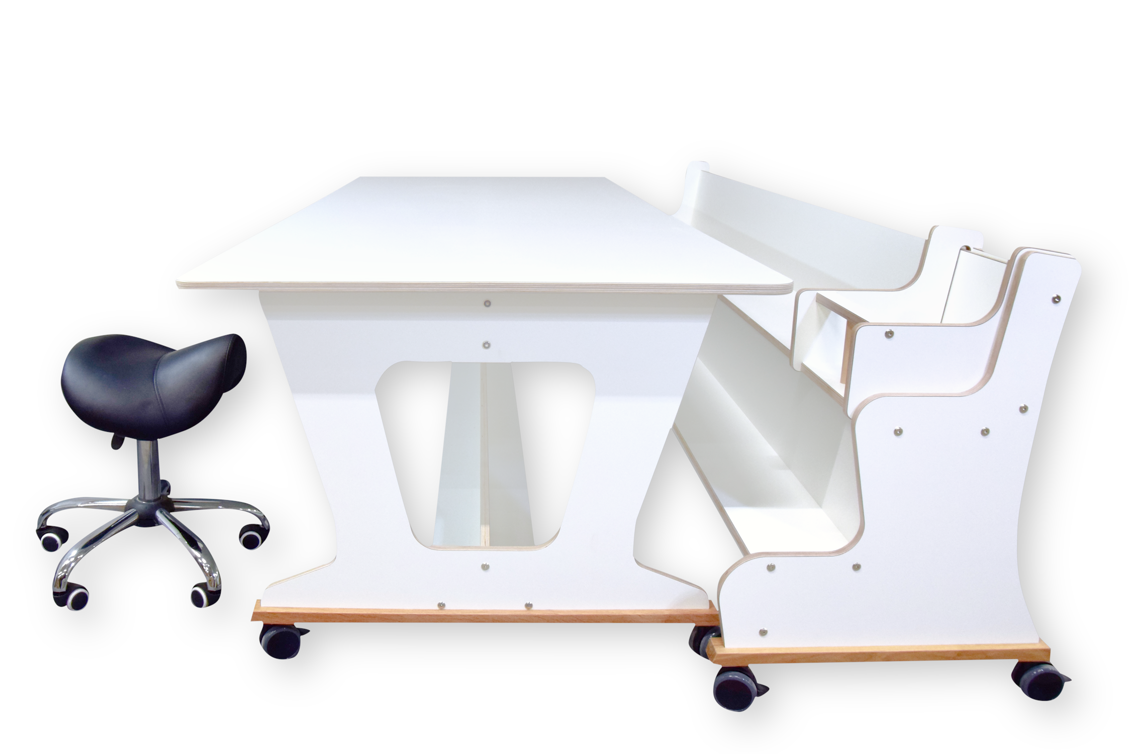 De tafel en bank zijn opgebouwd uit 18mm berken multiplex met witte hpl toplaag,