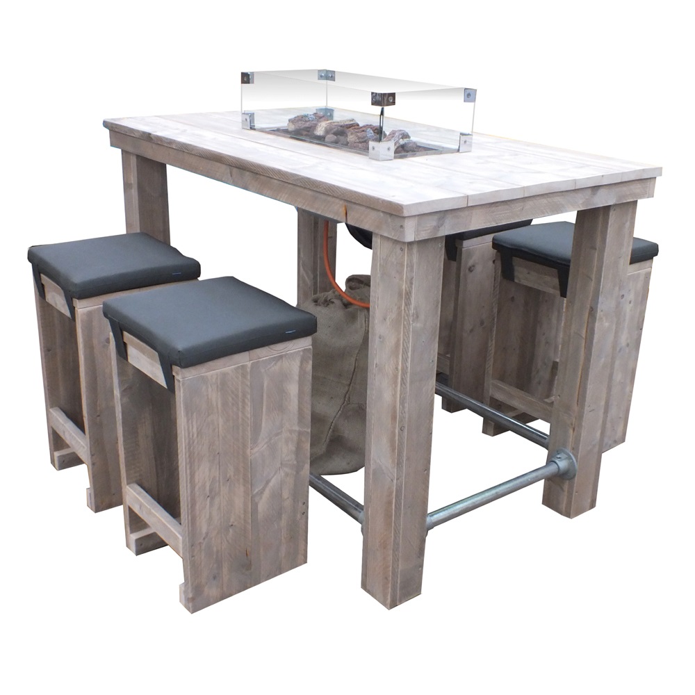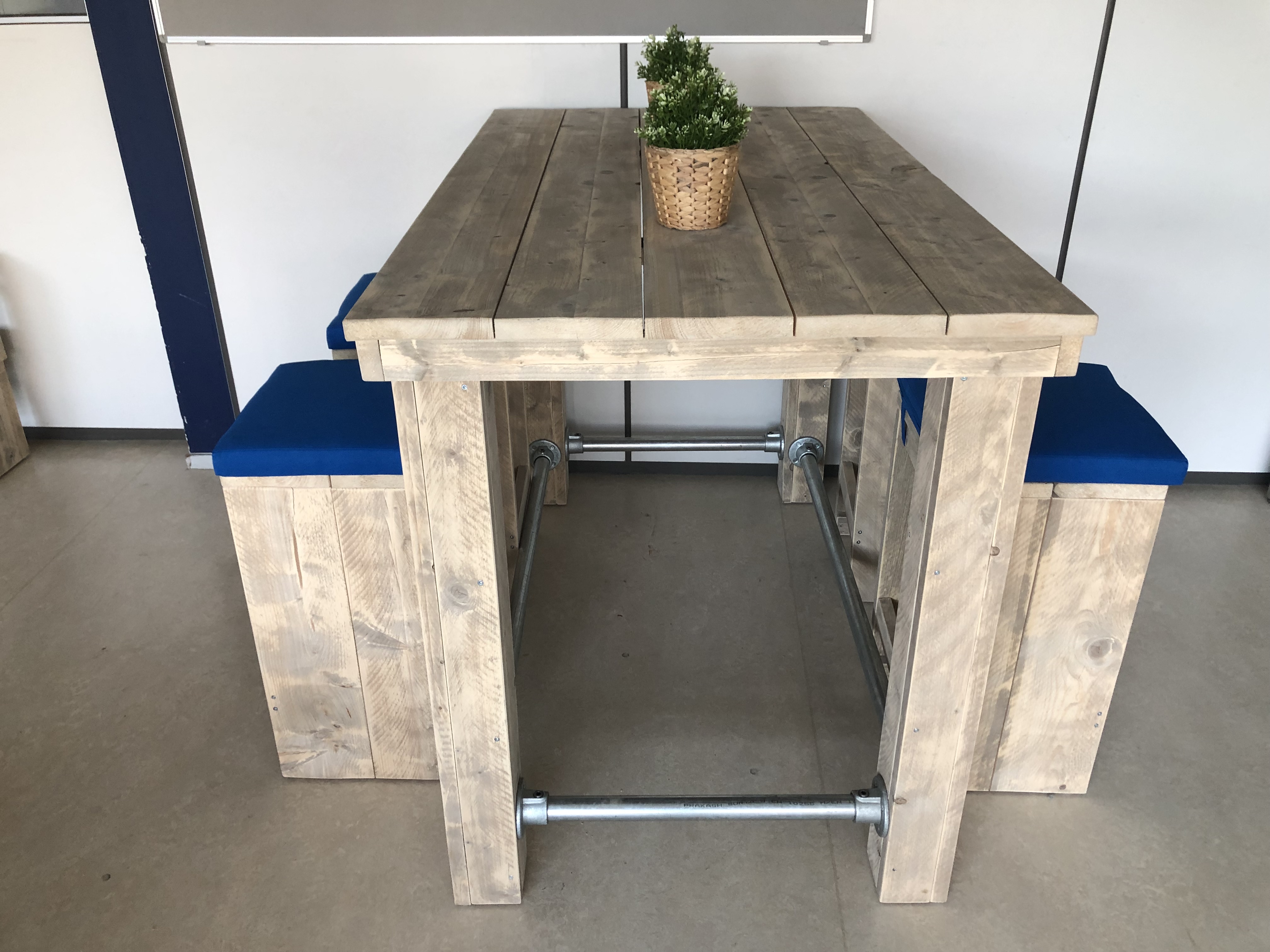 | Steigerhouten Barset Enjoy bestaat uit: 1 st. Steigerhouten Bartafel Enjoy, L 160 x D 95 x H 110 cm (met optioneel accessoires) 4 st. Steigerhouten Barkruk Enjoy L 40 x D 40 x H 75 cm (met optioneel zitkussen) Kenmerken: Gemaakt van Old-Look steigerhout. Geschuurde planken, geen splinters of ruwe oppervlakken en stofvrij Optioneel: kruk met rugleuning Kussens in bijna 70 verschillende kleuren optioneel verkrijgbaar bij Kruk-kussens Inbouwaccessoires optioneel verkrijgbaar Keuze in kleurafwerking van het steigerhout Impregneer behandeling optioneel verkrijgbaar bij Impregneer behandeling. Exclusief getoonde brander Krukkussens Onze Krukkussens worden standaard voorzien van linten, waarom doen wij dat? Meestal als iemand op een kruk gaat zitten dan schuift het kussen van de kruk af, wij vinden dat niet fijn, vandaar dat wij deze linten ook nog voorzien van een klittenband, zo kan deze zeer handig vast gemaakt worden aan de zitting van de kruk en kunt u makkelijker gaan zitten zonder dat de kussen van de kruk afglijd. En daarbij nog een klein ander voordeel, zo kan het kussen ook niet wegwaaien! Ook leuk om te doen: U kunt bijvoorbeeld ook 4 verschillende soorten kleuren krukkussens nemen voor een leuk speels effect. Hoe dan? Geef na de bestelling van de krukkussens de kleuren door in het winkelmandje bij notities, wij zorgen er dan voor dat deze bij u geleverd worden. Omdat u de keuze heeft in verschillende kleuren of kleur opstellingen van de krukkussens zullen deze voor u op maat gemaakt worden en na ca. 2 weken geleverd worden. Houdt er rekening mee dat het in het hoogseizoen drukker is dan normaal en dat dit de levertijd kan beïnvloeden. Impregneer behandeling uw kunt uw tafel laten voorzien van een impregneer behandeling, met deze transparante impregneer-spray voorkomt u namelijk de kans op vervelende vlekken die in het hout kunnen trekken en u zo langer plezier heeft van uw barset. Voordat u besteld, let op het volgende: Oorspronkelijk zijn steigerplanken bedoeld voor een bouwsteiger om erover heen te lopen. Als basismateriaal voor meubelen is steigerhout erg populair. Omdat dit bij steigerplanken niet het geval is zitten hier soms wat nadelen aan: Vooral in de winter als er gestookt gaat worden kan het hout nog iets gaan krimpen, Het plaatsen in een vochtige omgeving of het (zelf) verven van dit hout kan dit proces verergeren. Verder is steigerhout een vuren houtsoort en daardoor zacht, Het grootste nadeel van steigerhout is de 10% groei en krimptolerantie. Bij het bestellen van steigerhouten meubels gaat u ermee akkoord dat u op de hoogte bent van deze nadelen. |