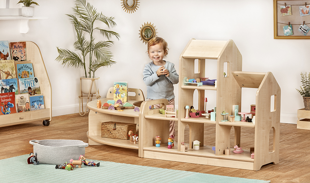Creëer een natuurlijke scheiding in de groepsruimte met dit unieke, prachtig vormgegeven poppenhuis.