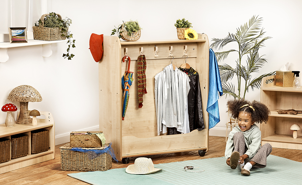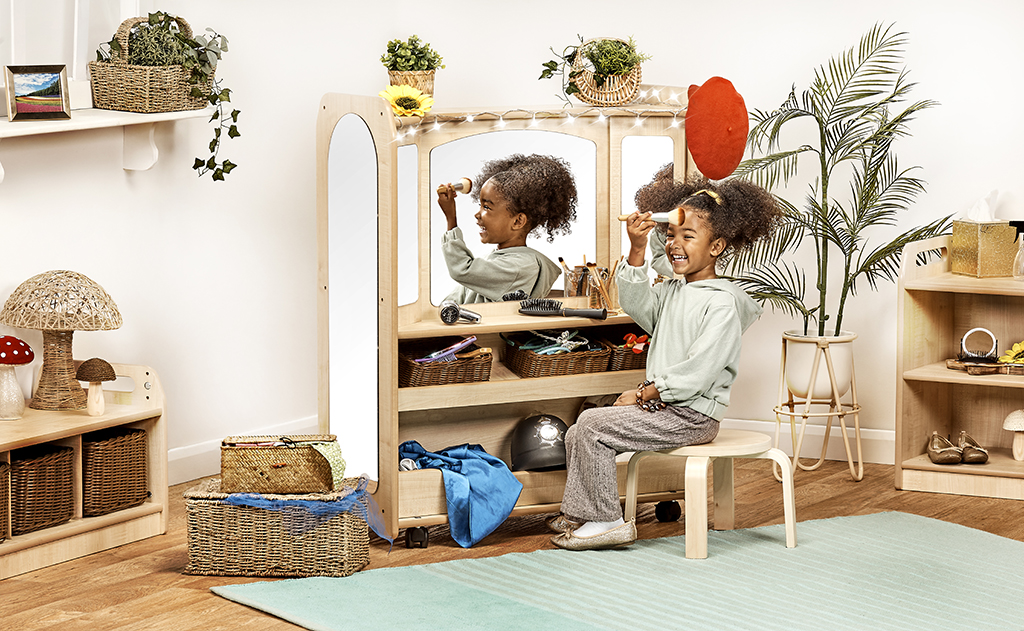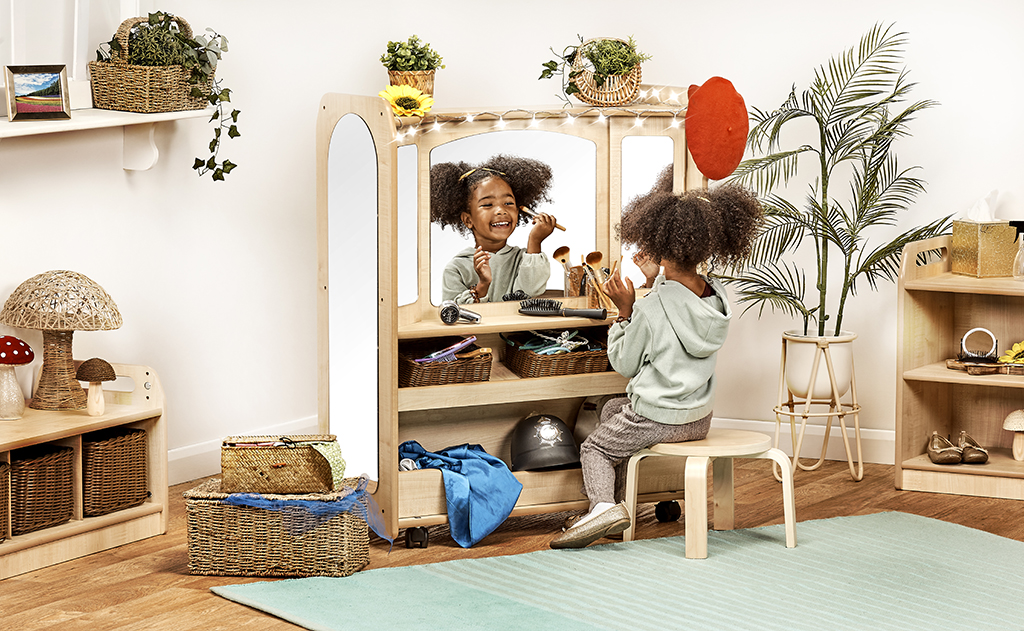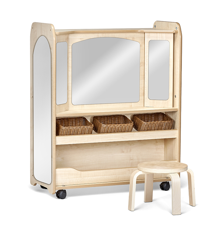 Voeg een vleugje Hollywood-glamour toe aan de speelruimte van jonge kinderen met dit prachtig vormgegeven, compacte verkleedstation.