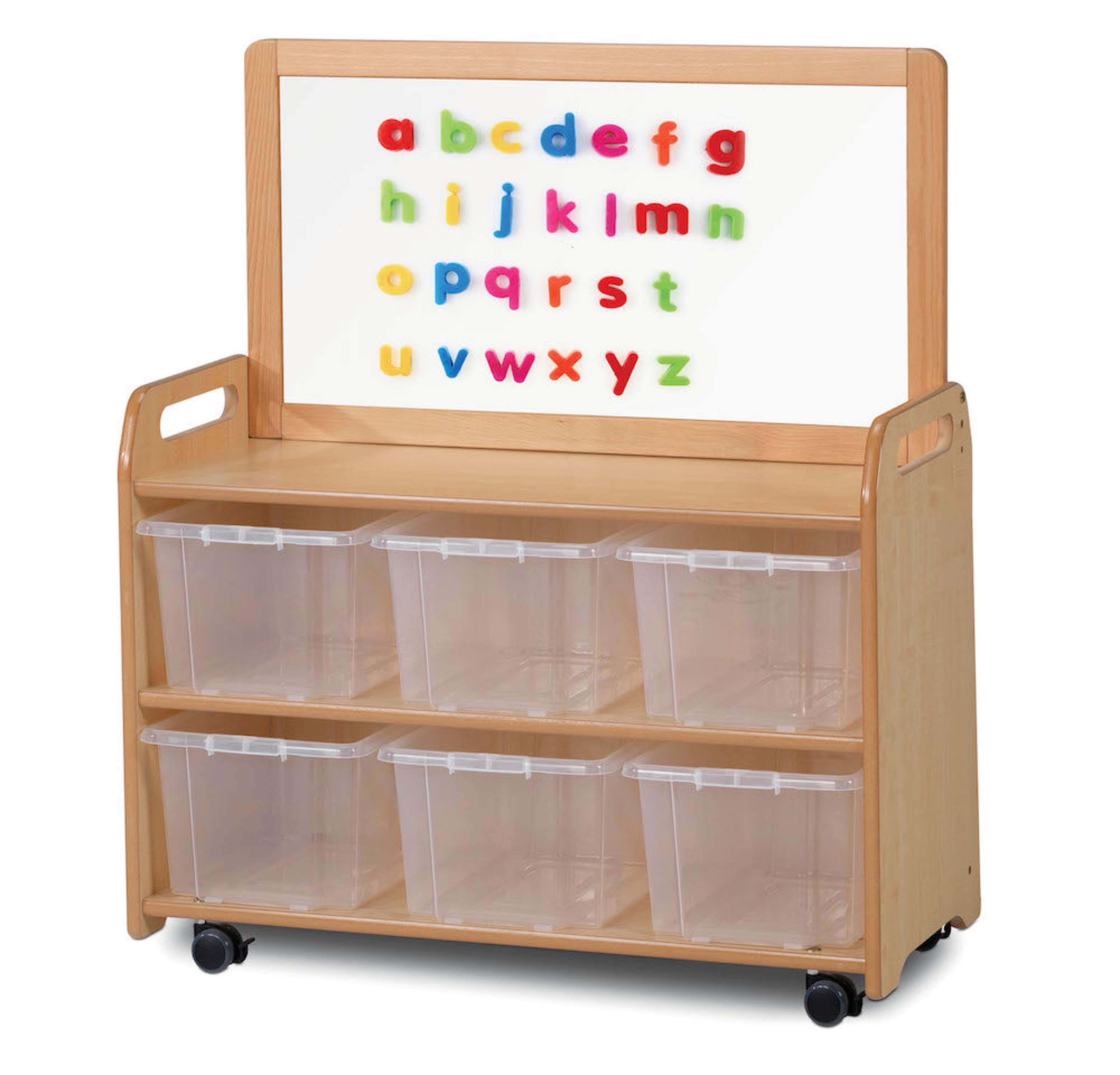 Mobiele opbergunit met 6 doorzichtige bakken om materialen te organiseren