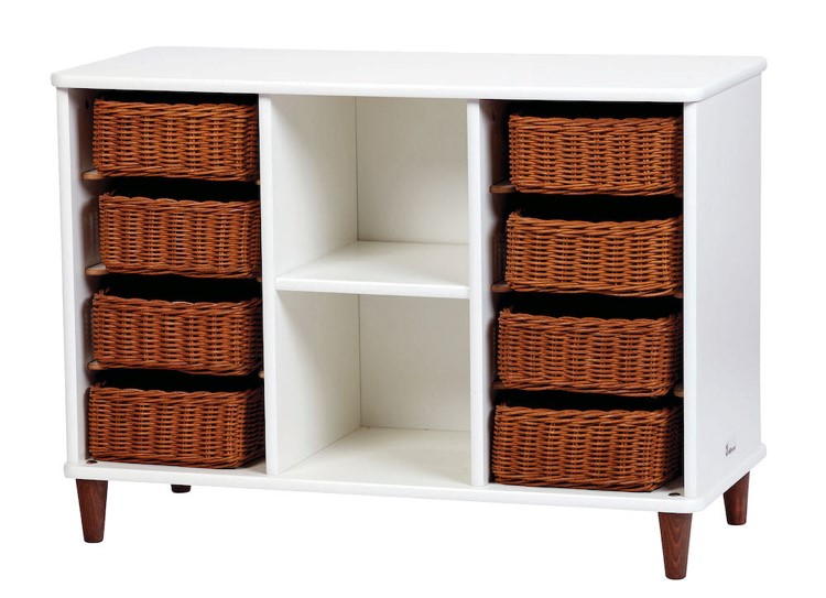 Witte vrijstaande kast met twee planken en acht ondiepe opbergmanden.