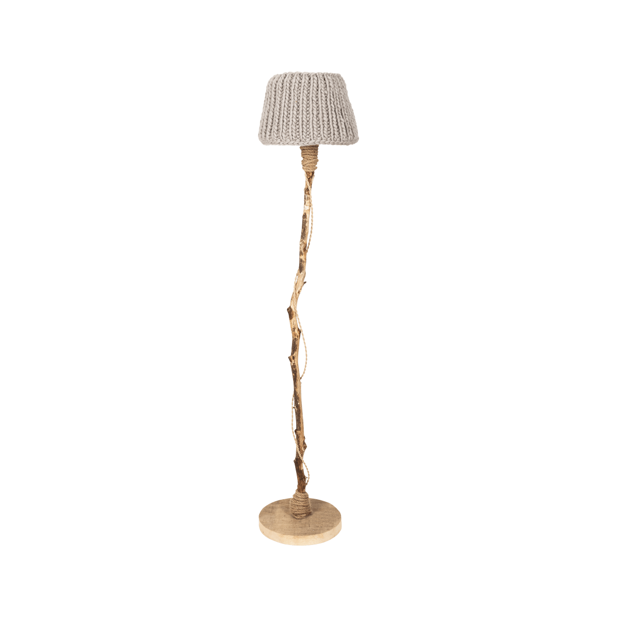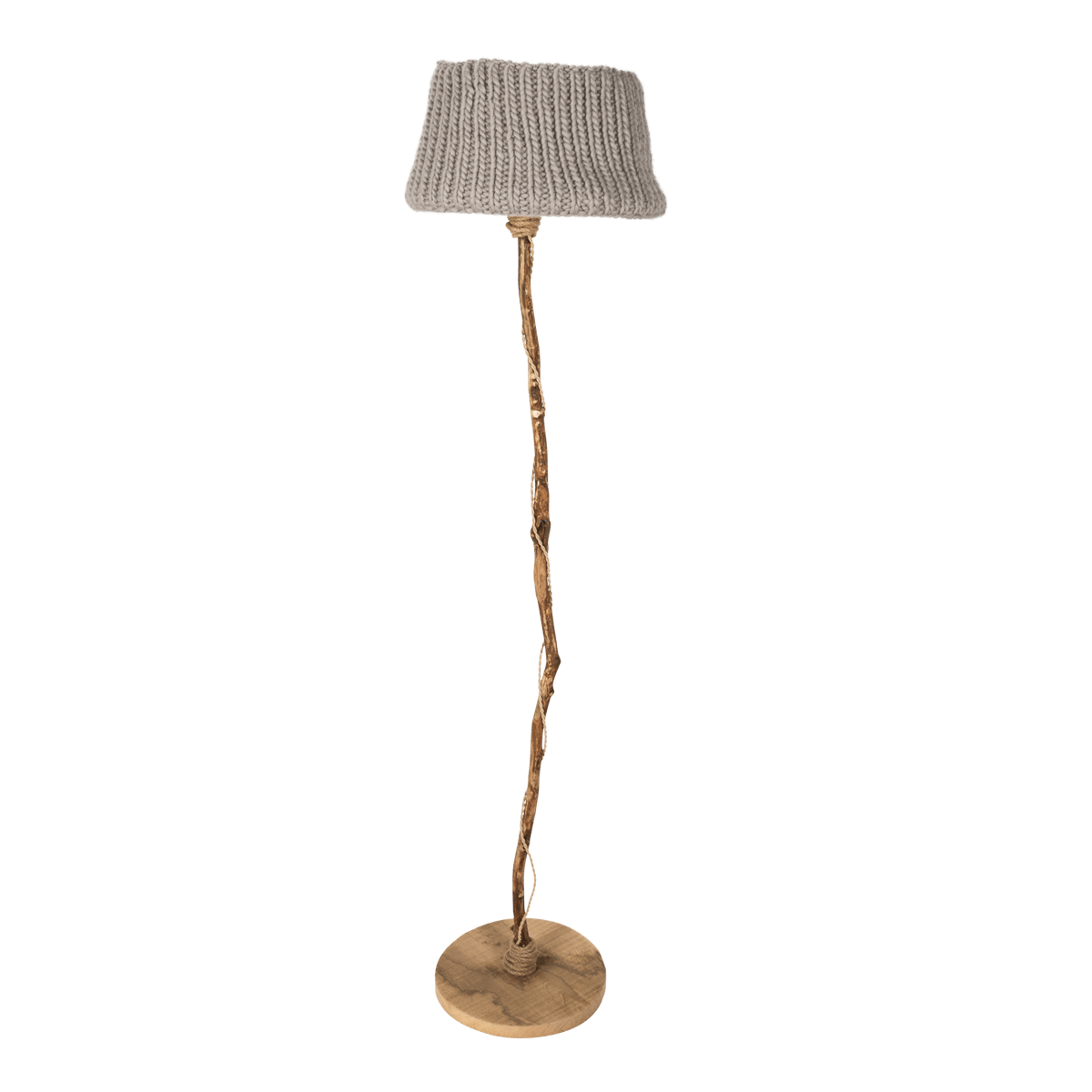Een houten vloerlamp met eiken voet en sierlijke tak.