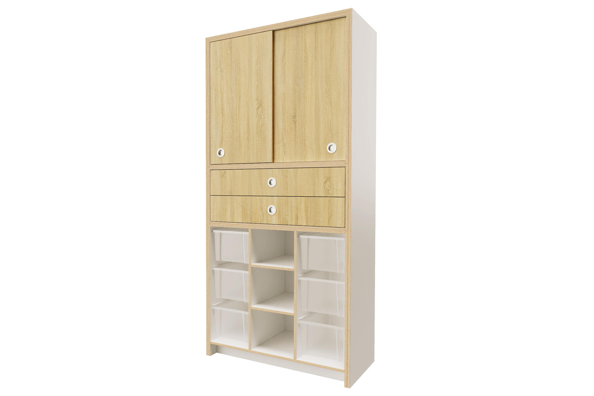 De laden en schuifdeuren zijn leverbaar in een houtdecor naar keuze.Ā