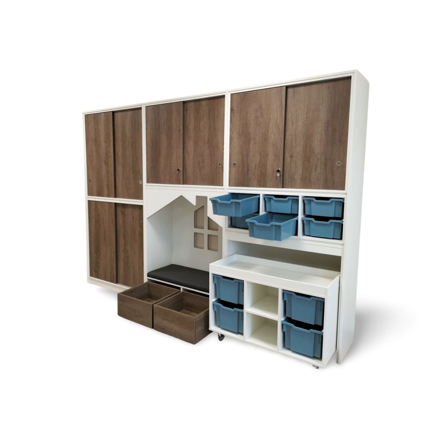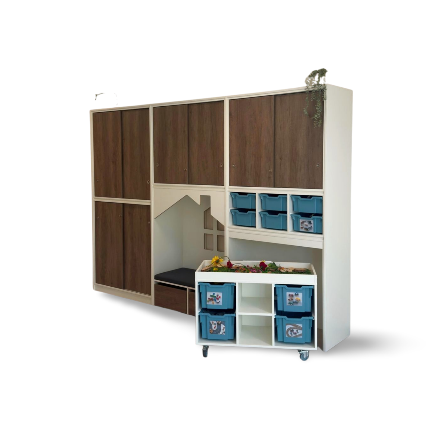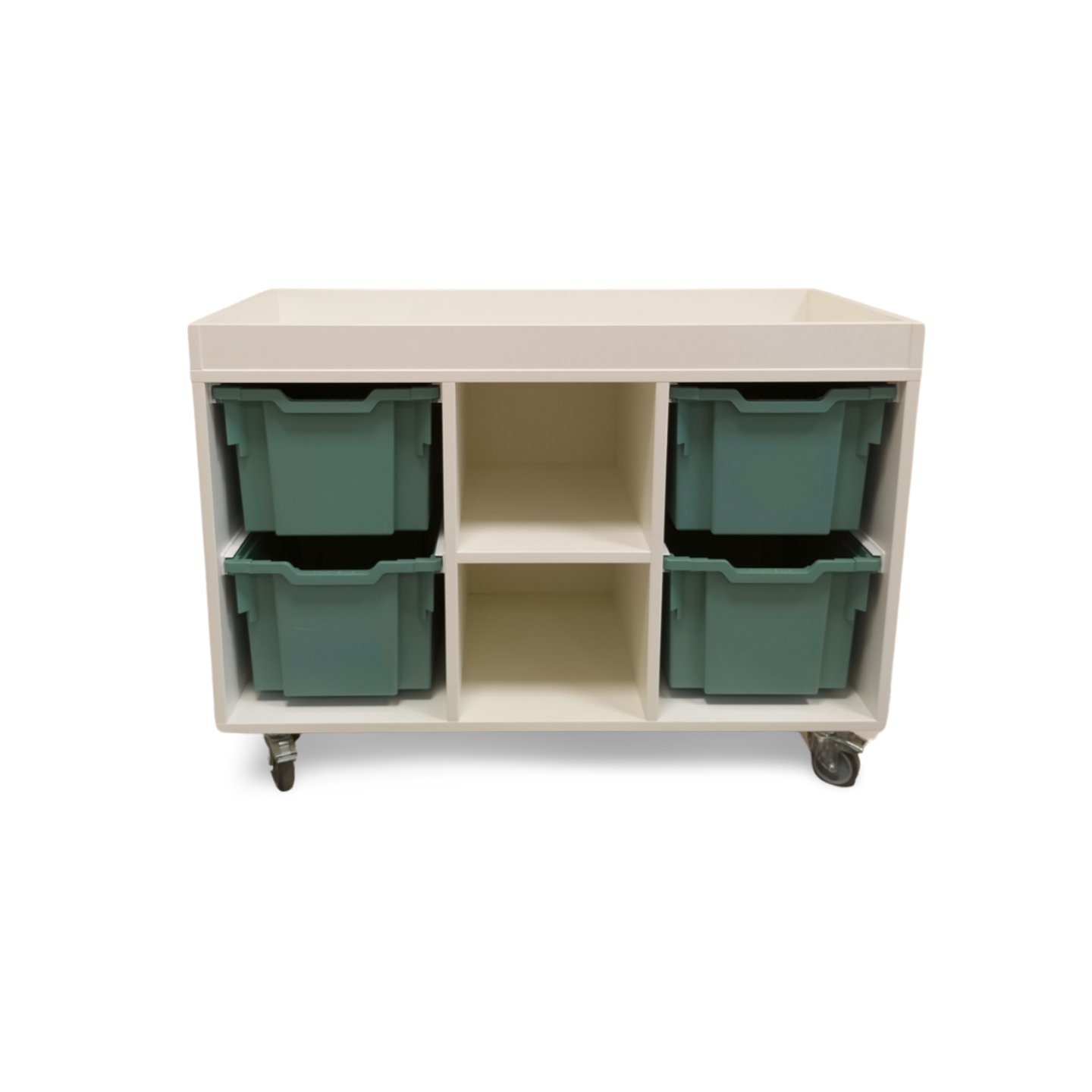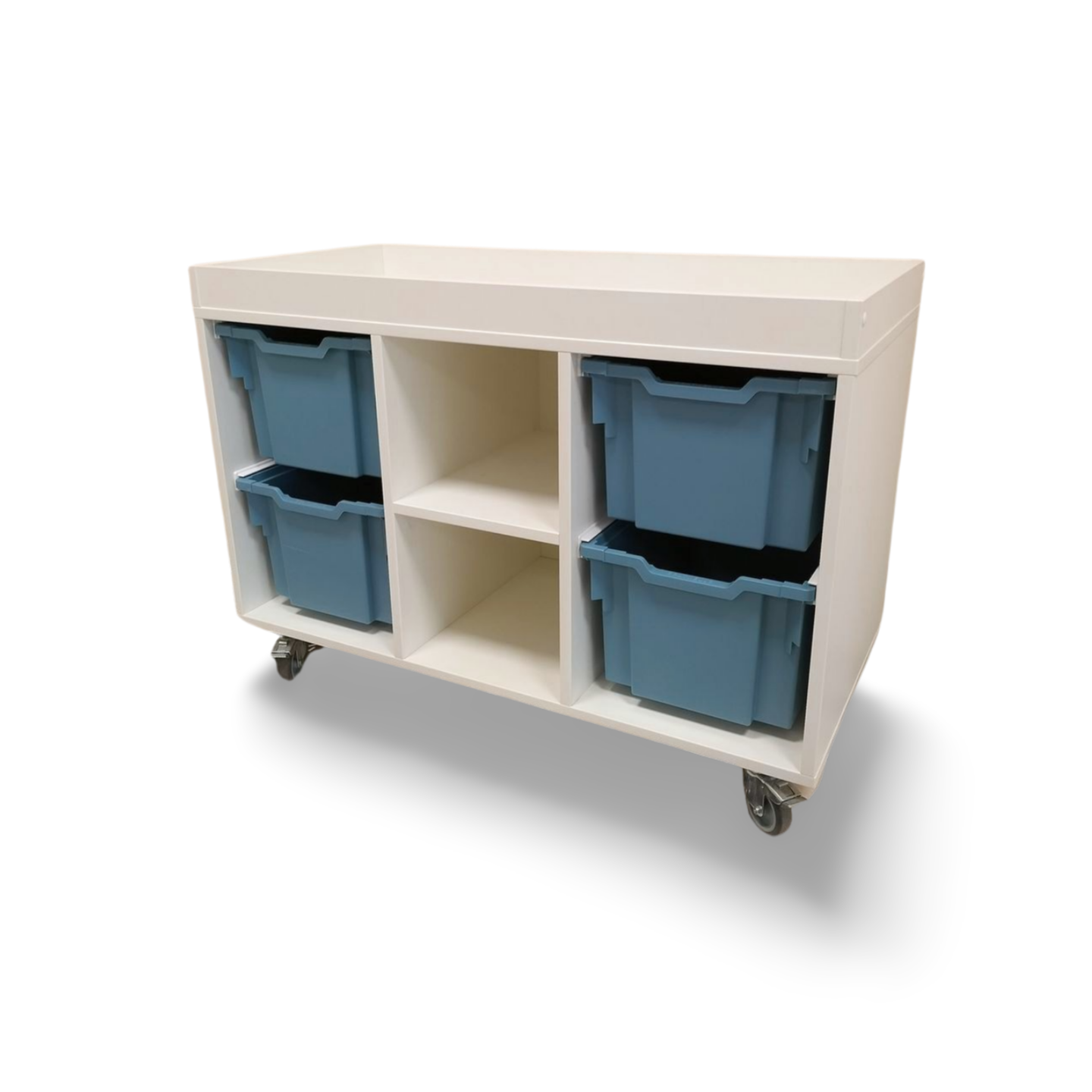 een lage speeltafel inclusief 4 middelhoge Gratnell lades H15 in een kleur naar keuze.