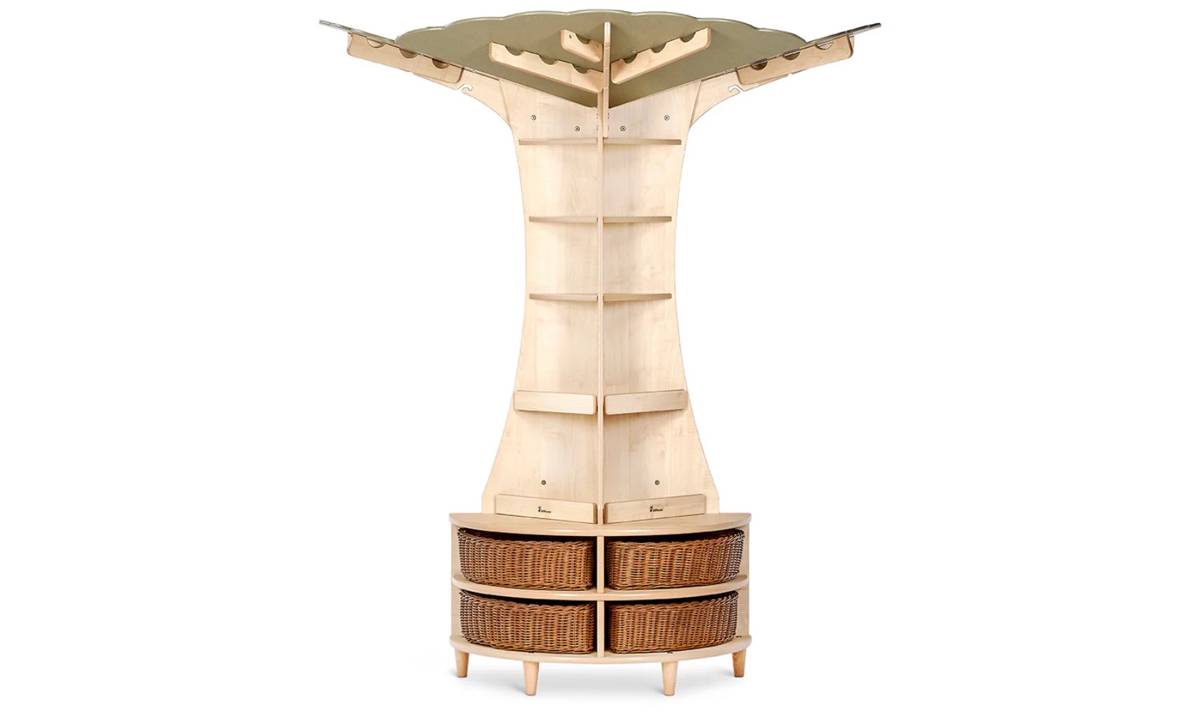 De ronde esdoornhouten voet zorgt voor een praktische afwerking, met vier opbergmanden in de hoeken