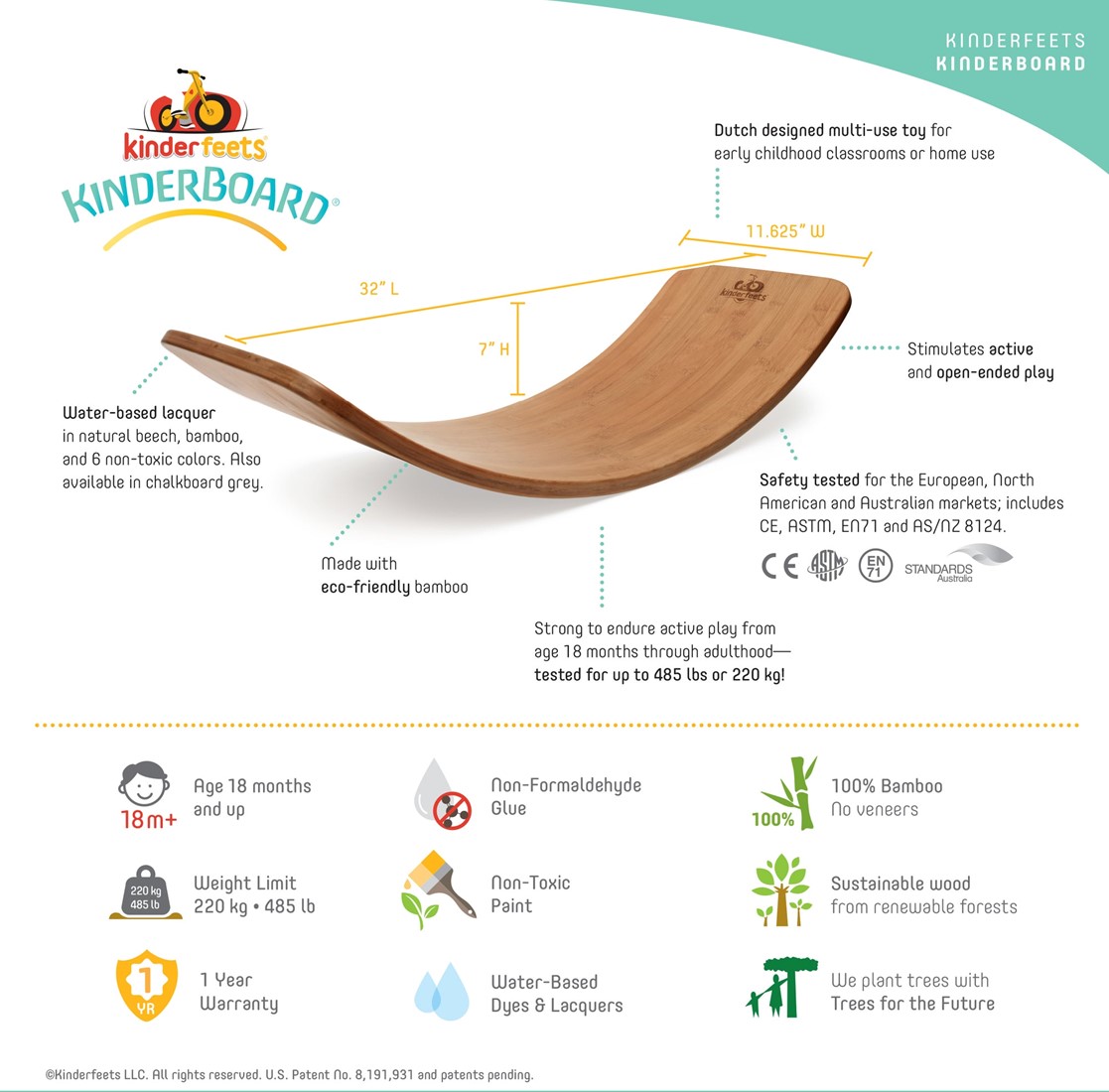 Het Balance Board van Kinderfeets is gemaakt van FSC-gecertificeerde bamboe en is belastbaar tot 220 kg.