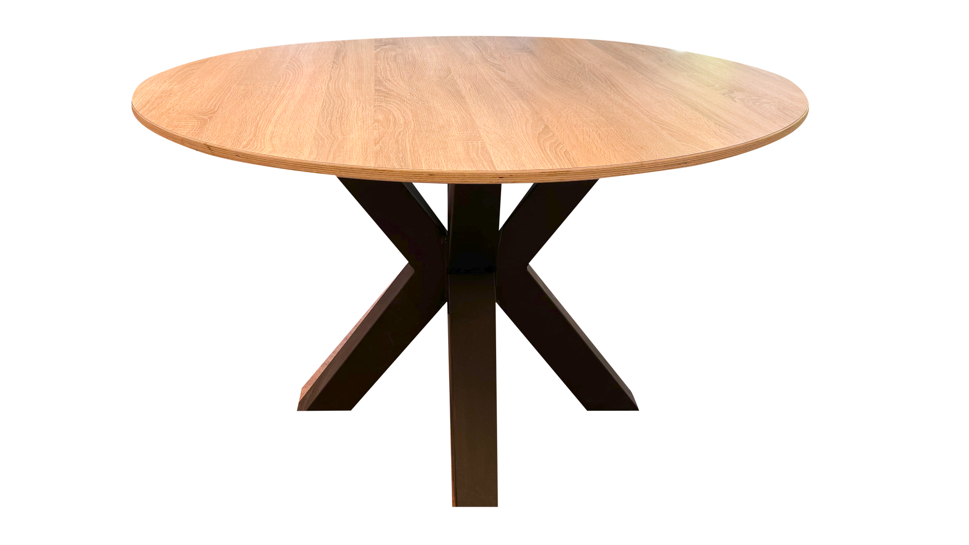 De tafels met kruispoten zijn zowel leverbaar met een rond als een ovaal tafelblad.