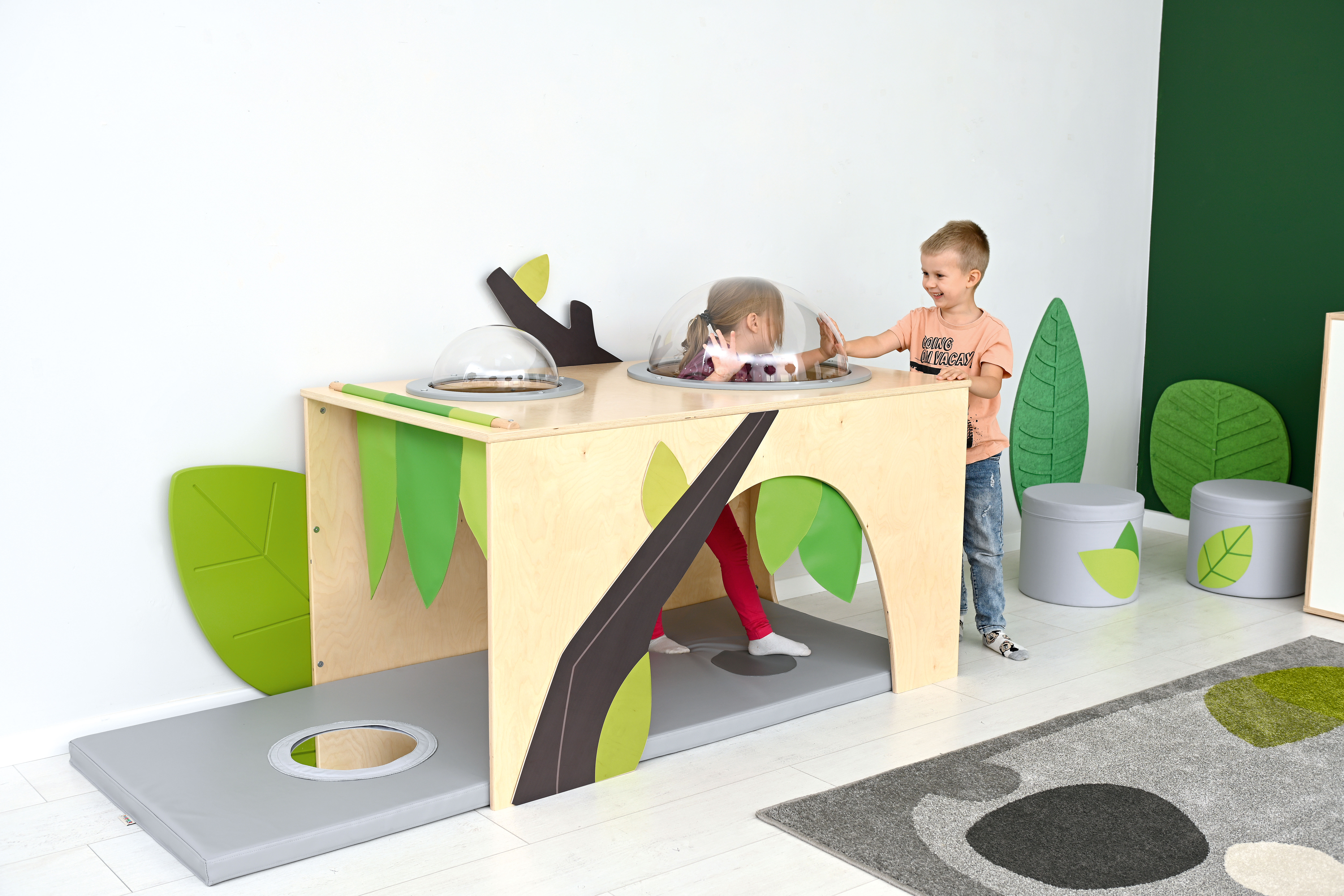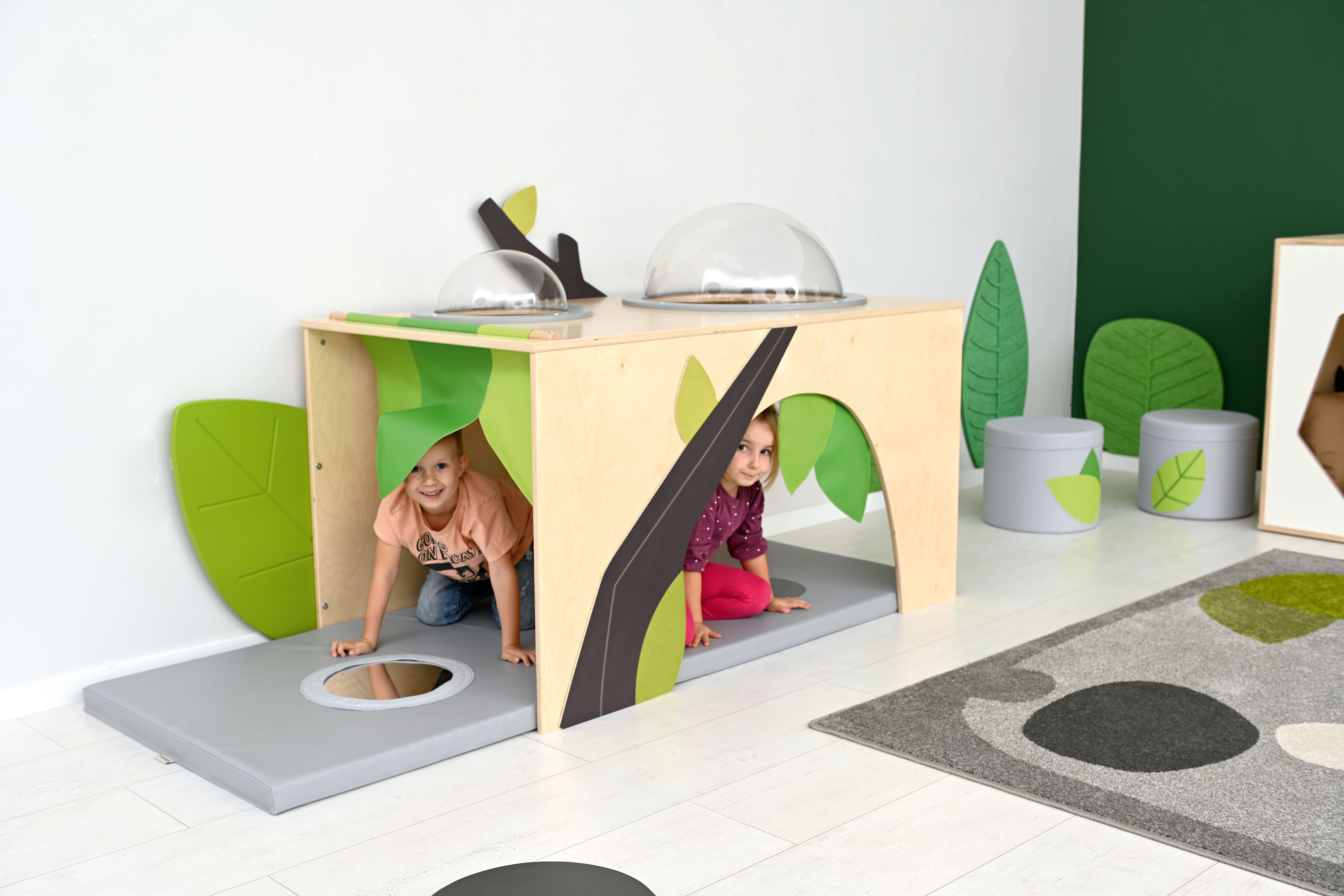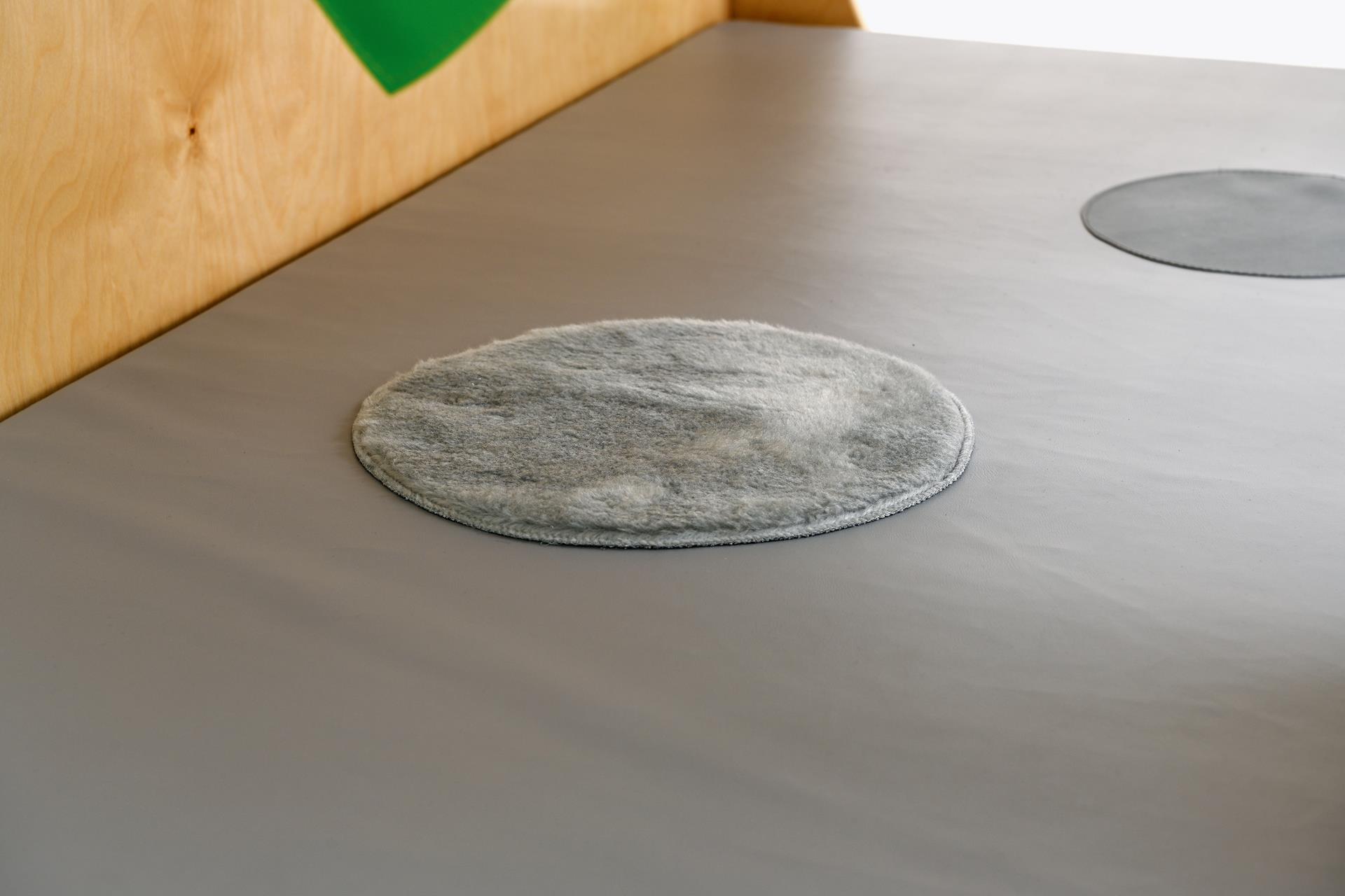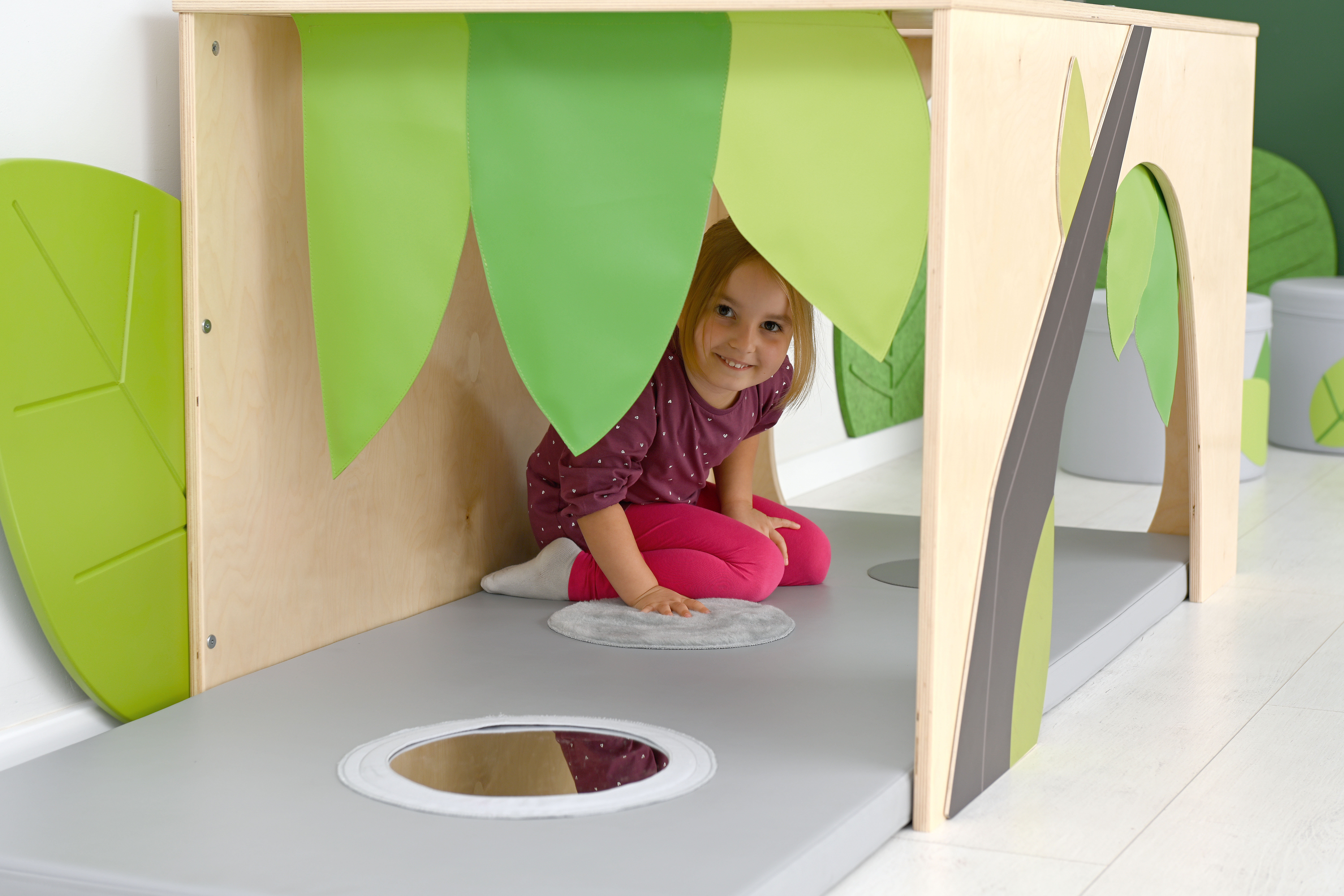 De hoek is voorzien van een zacht matras met sensorische stiksels en een spiegel.