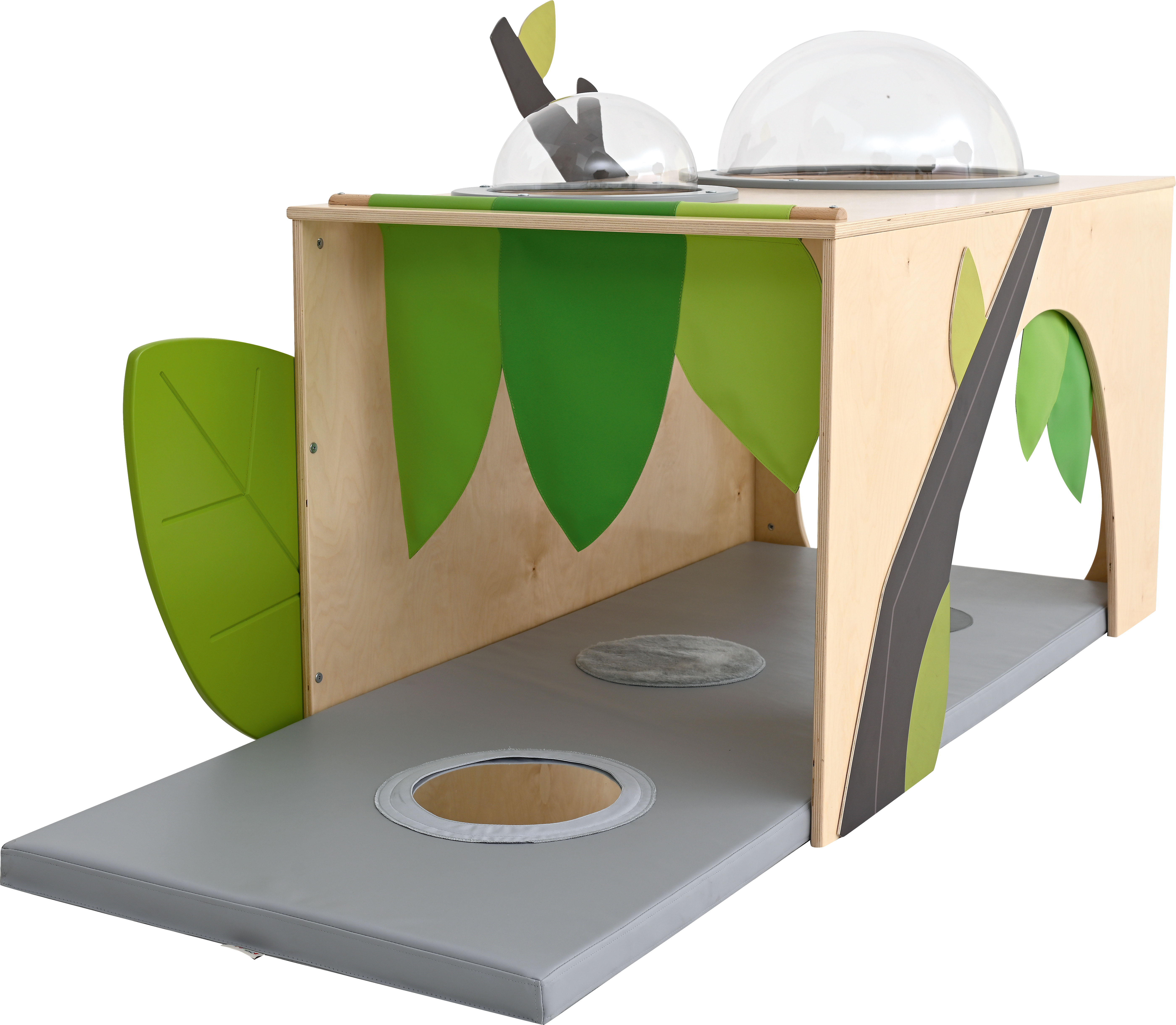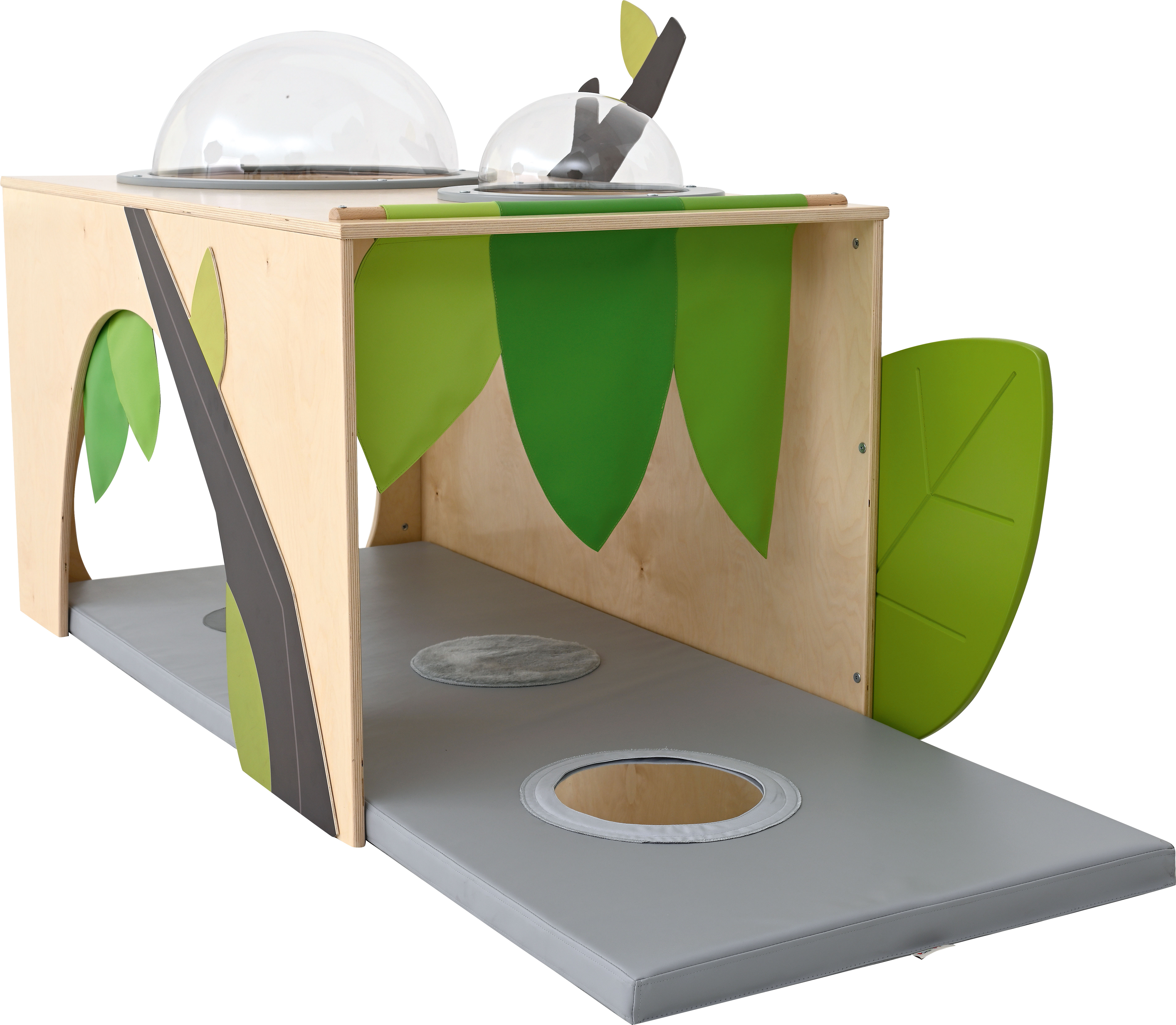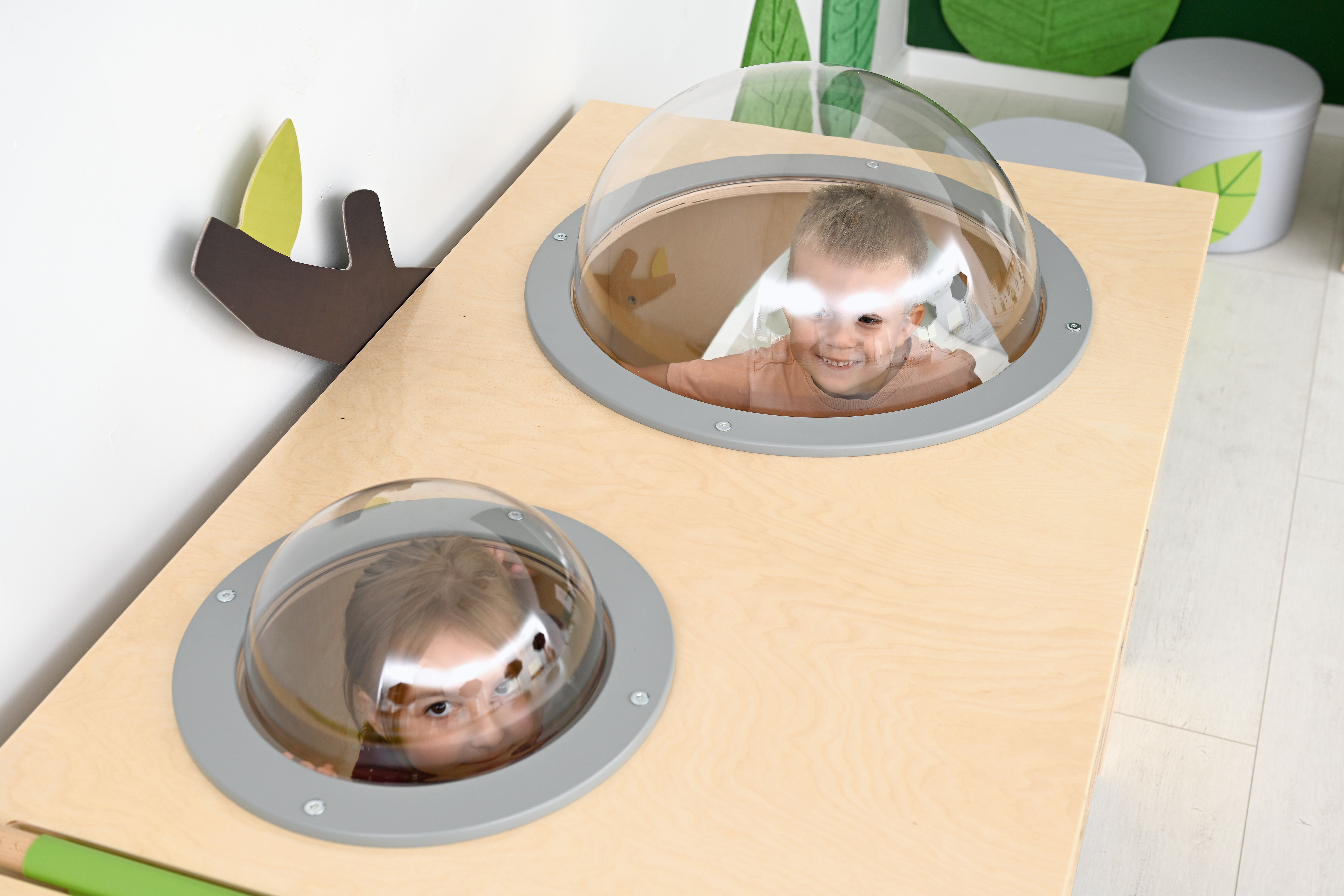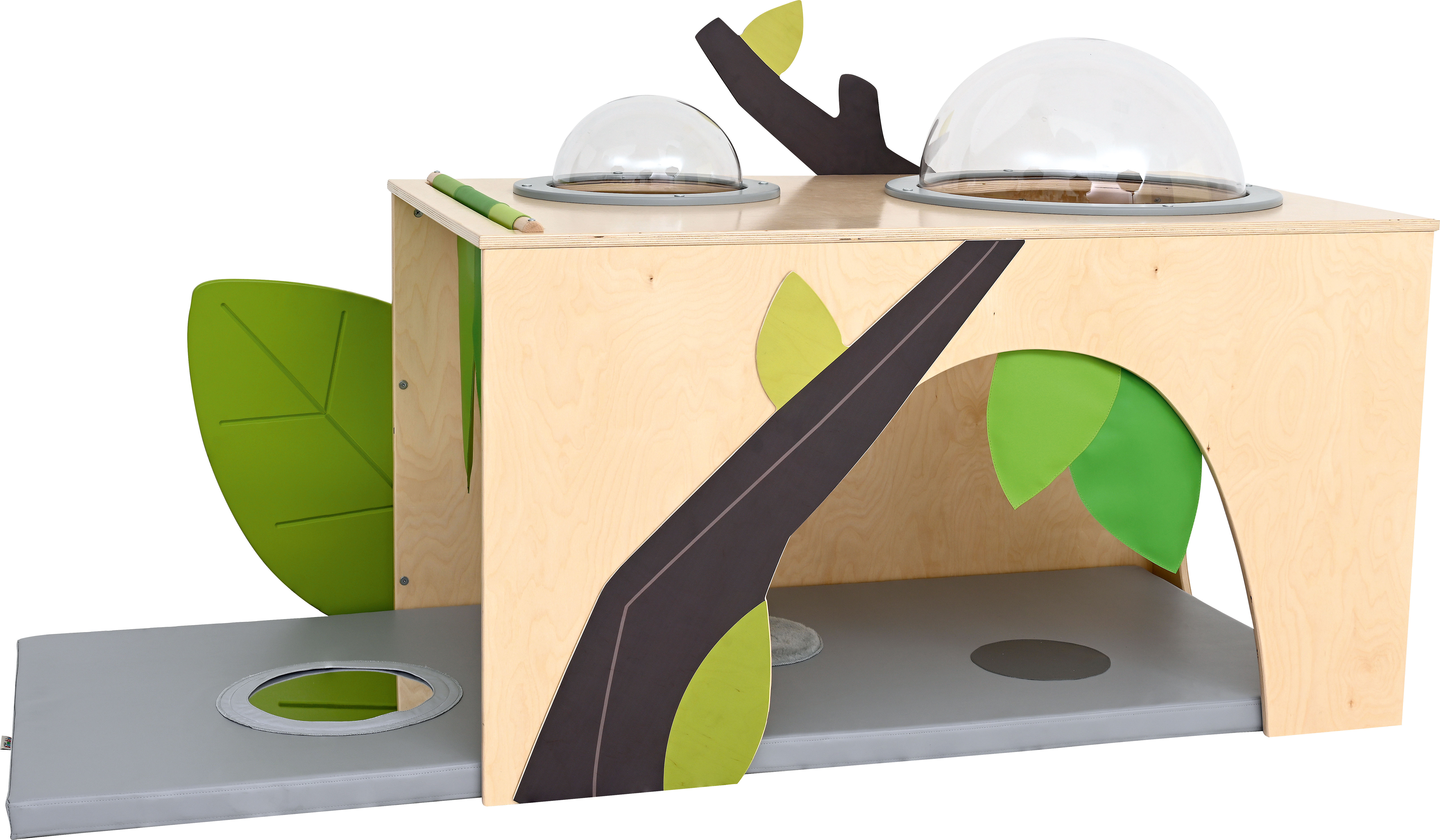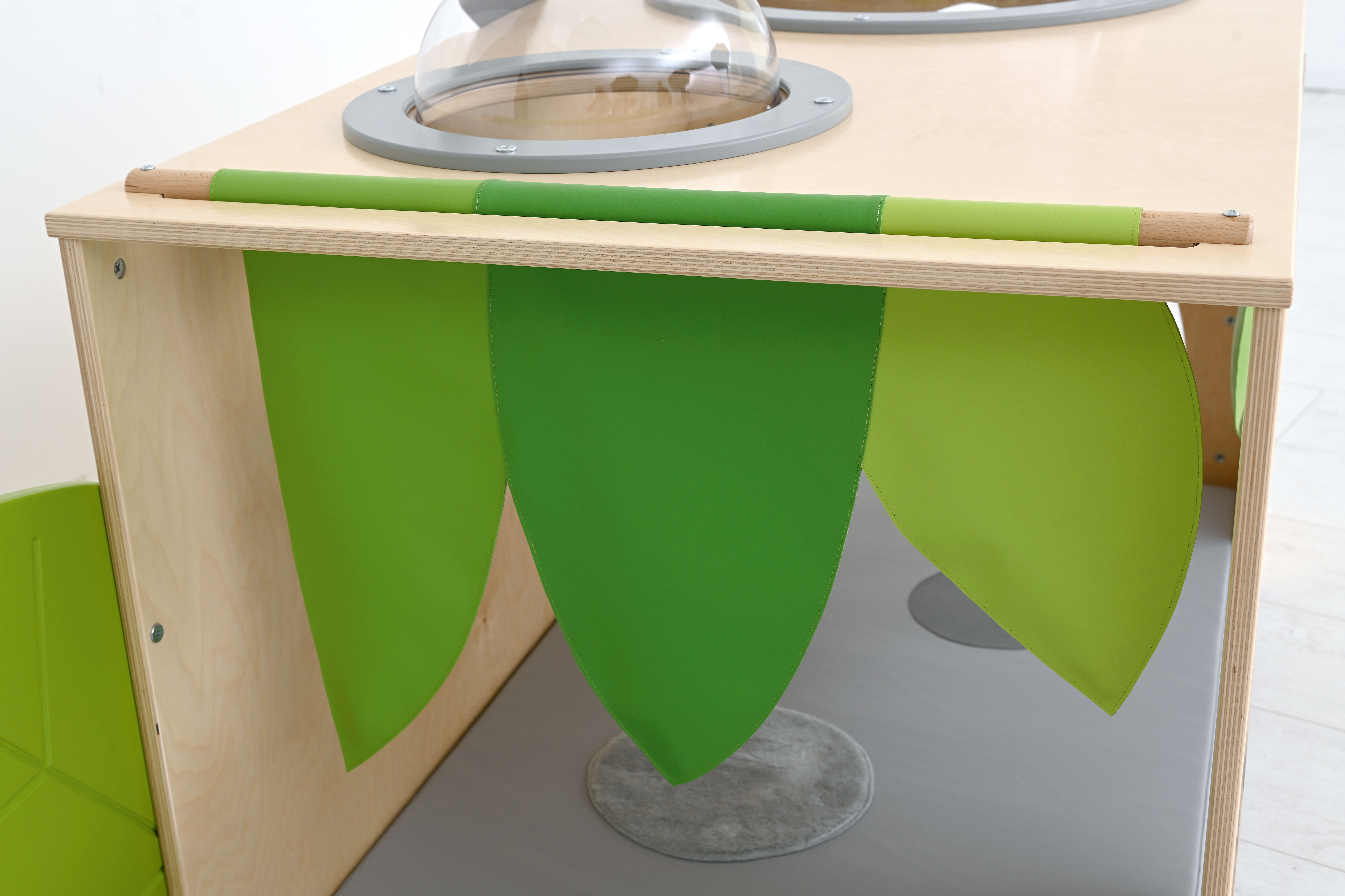 De hoek is voorzien van een zacht matras met sensorische stiksels en een spiegel.