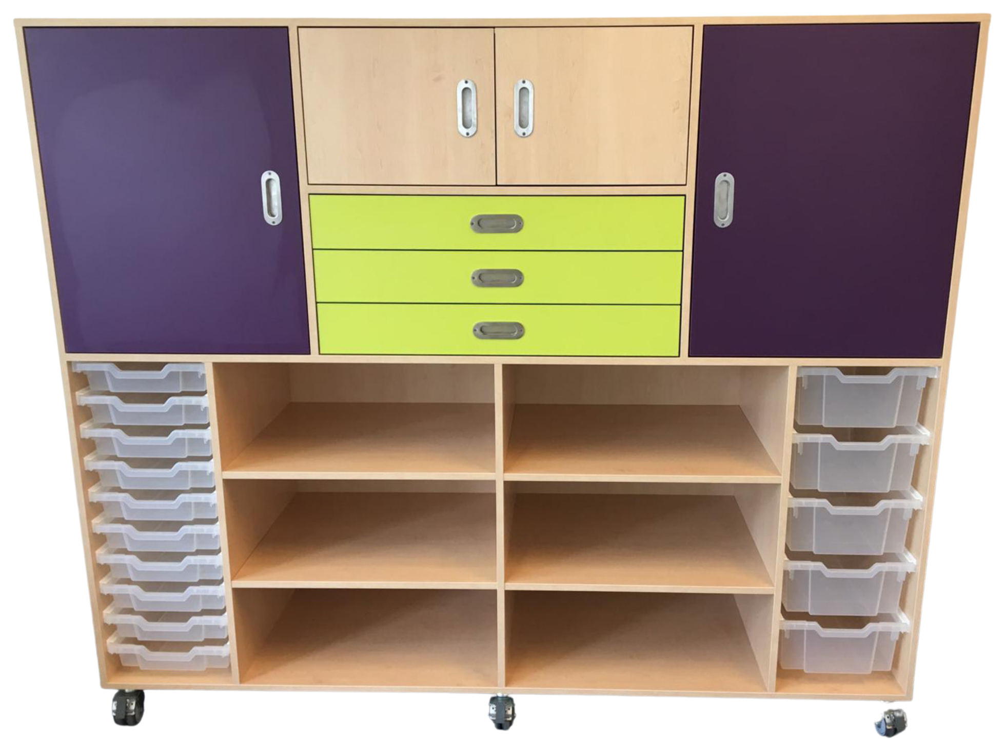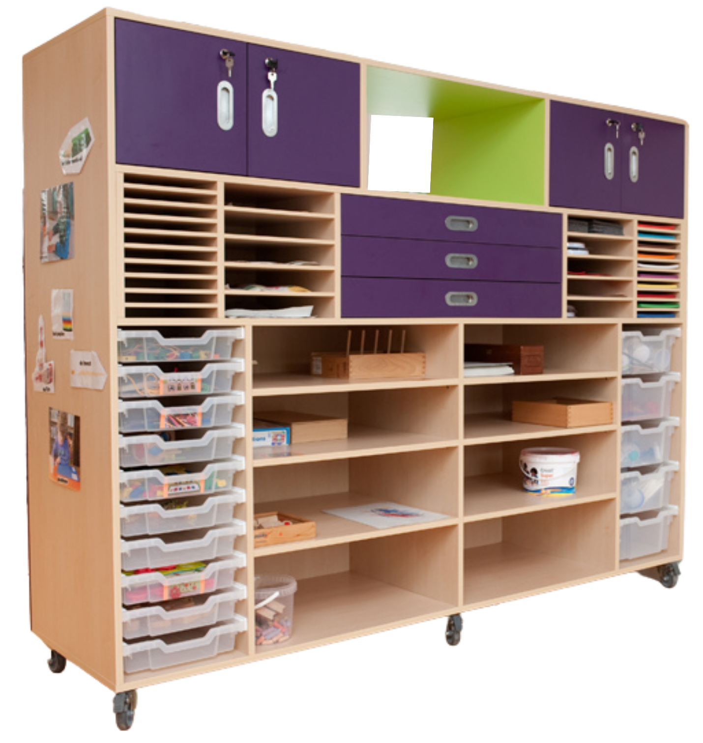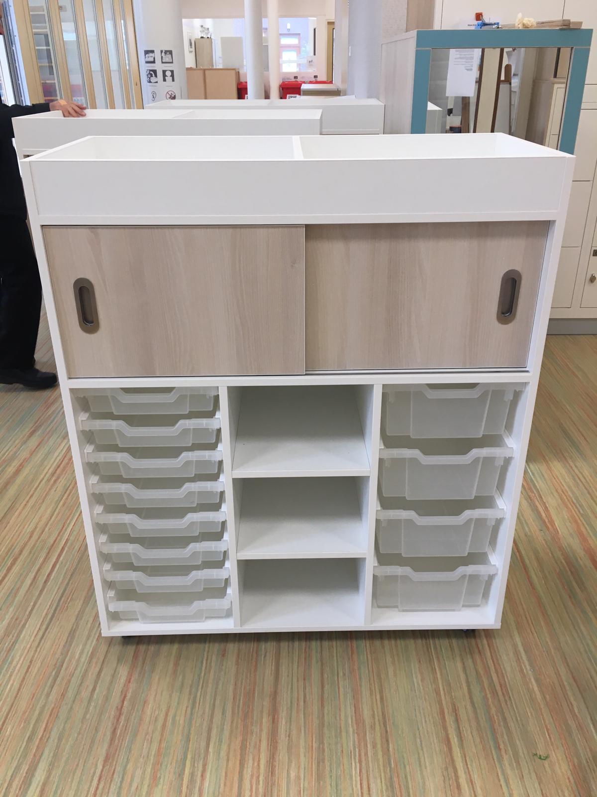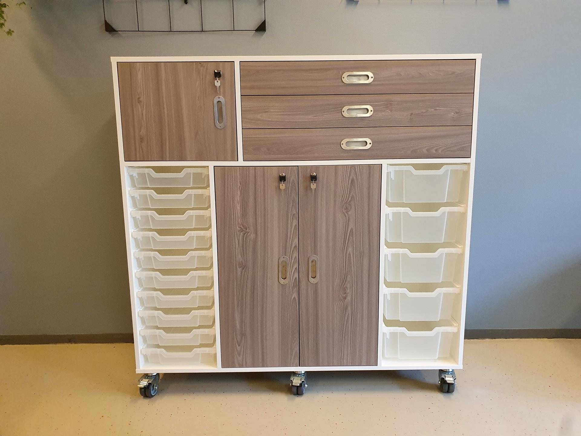 Combineer open vakken, deurtjes en laden tot een functionele atelierkast.