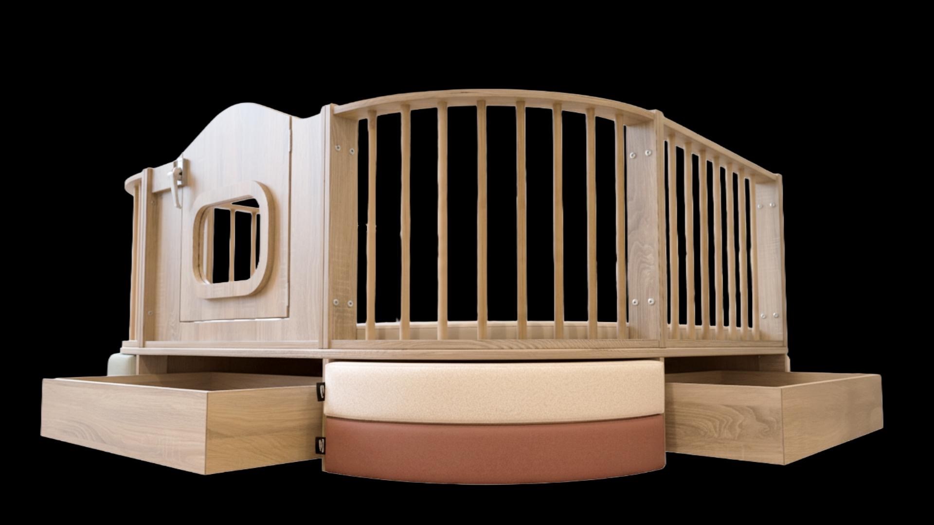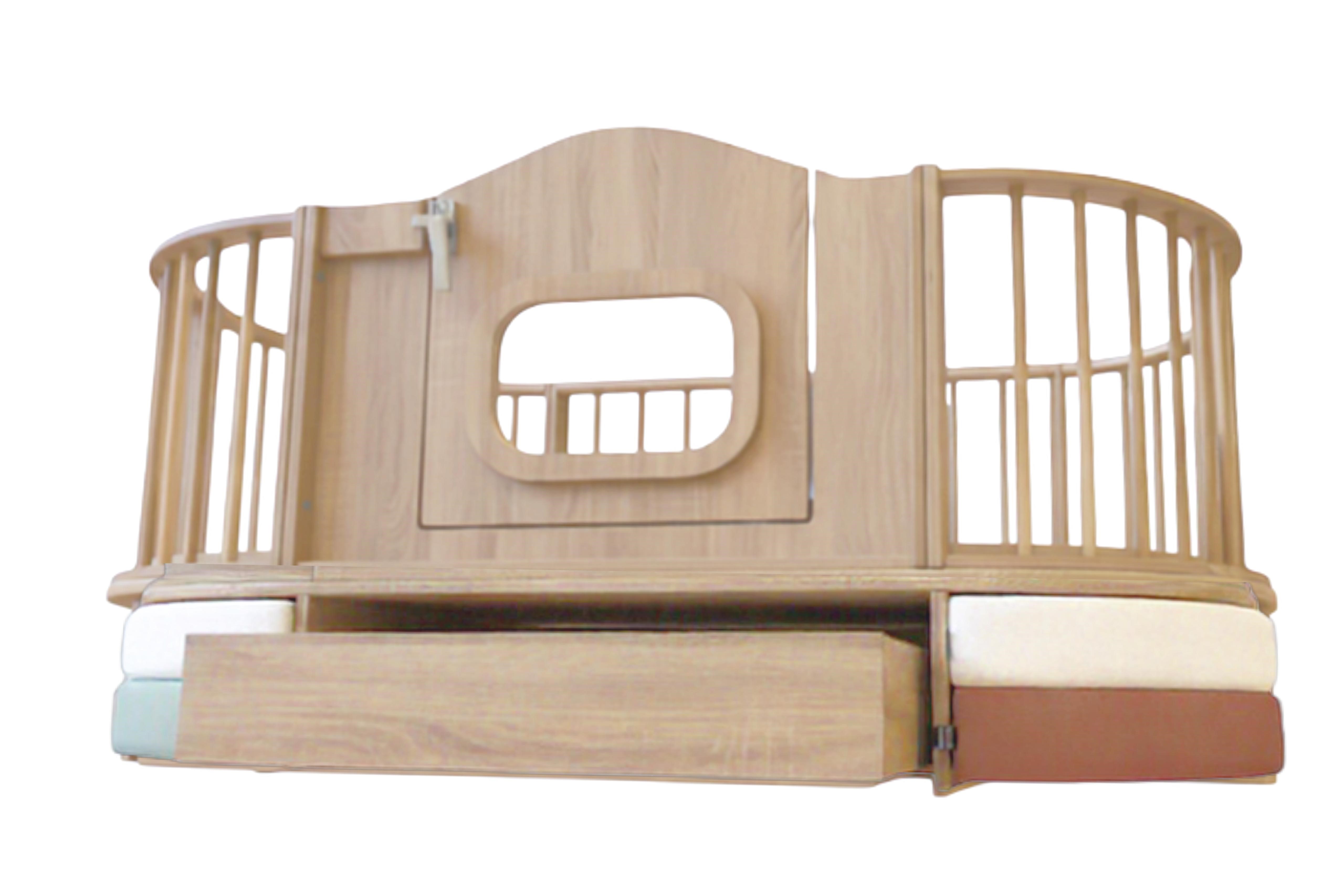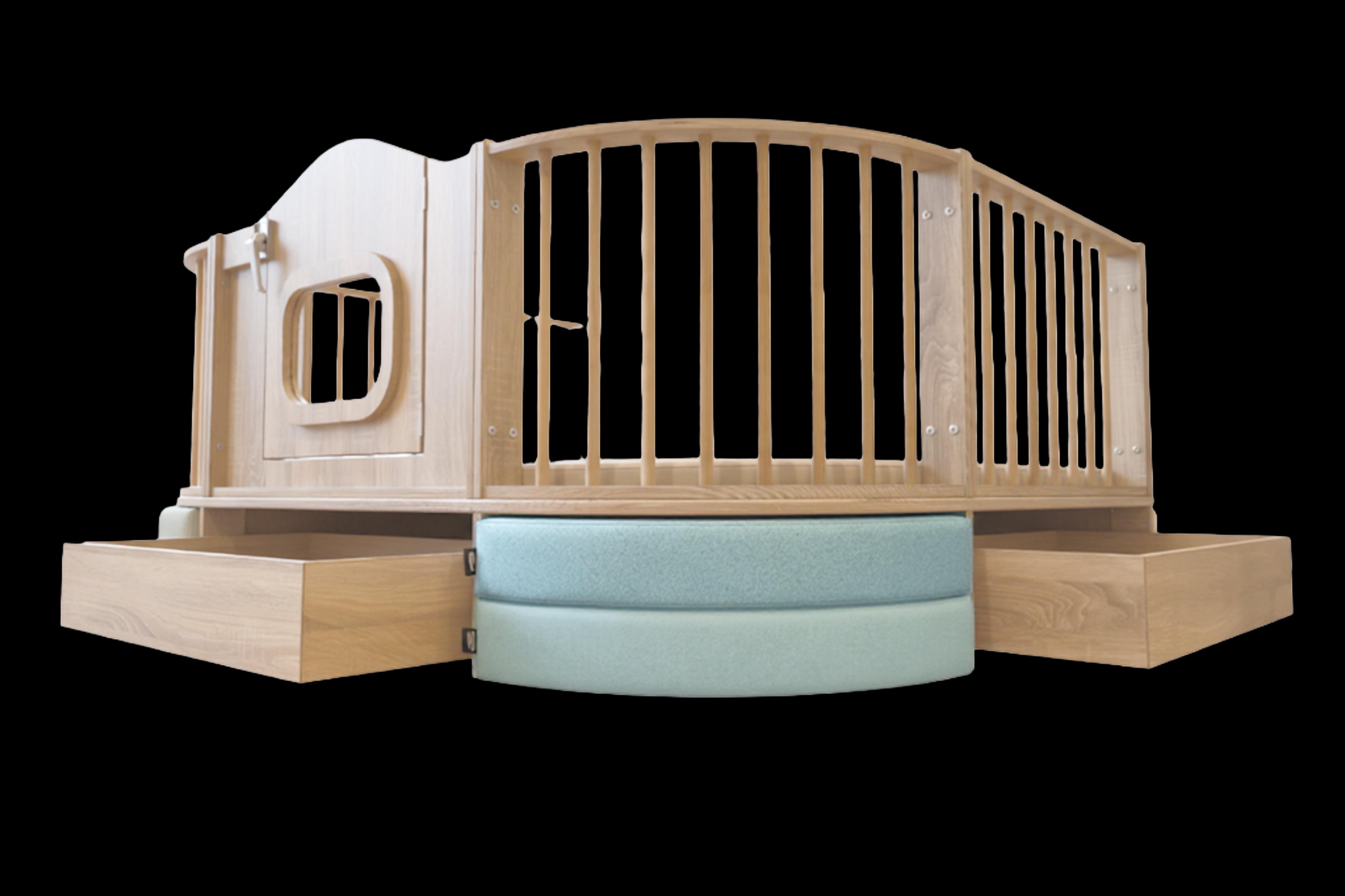 Uitgevoerd met 3 laden met in de hoeken ruimte voor het opberken van speelkussen.