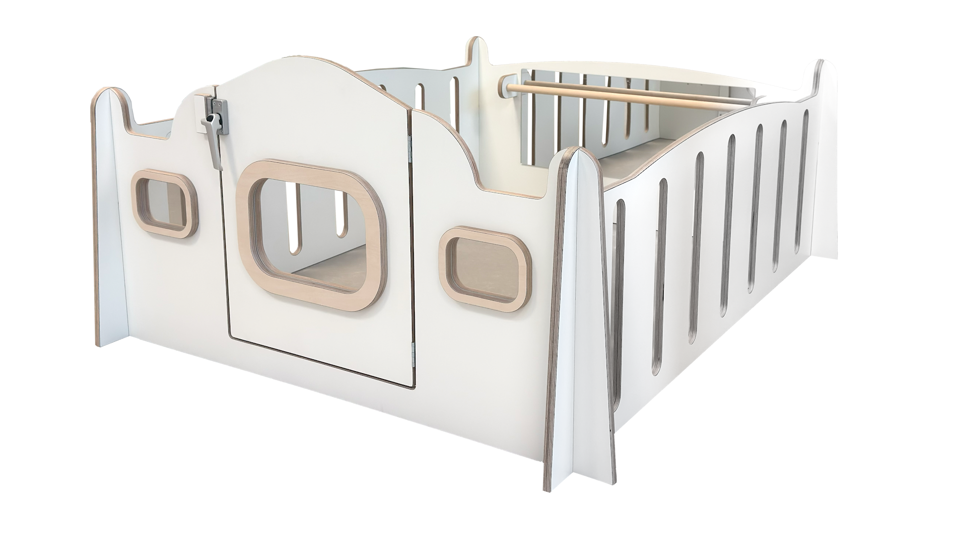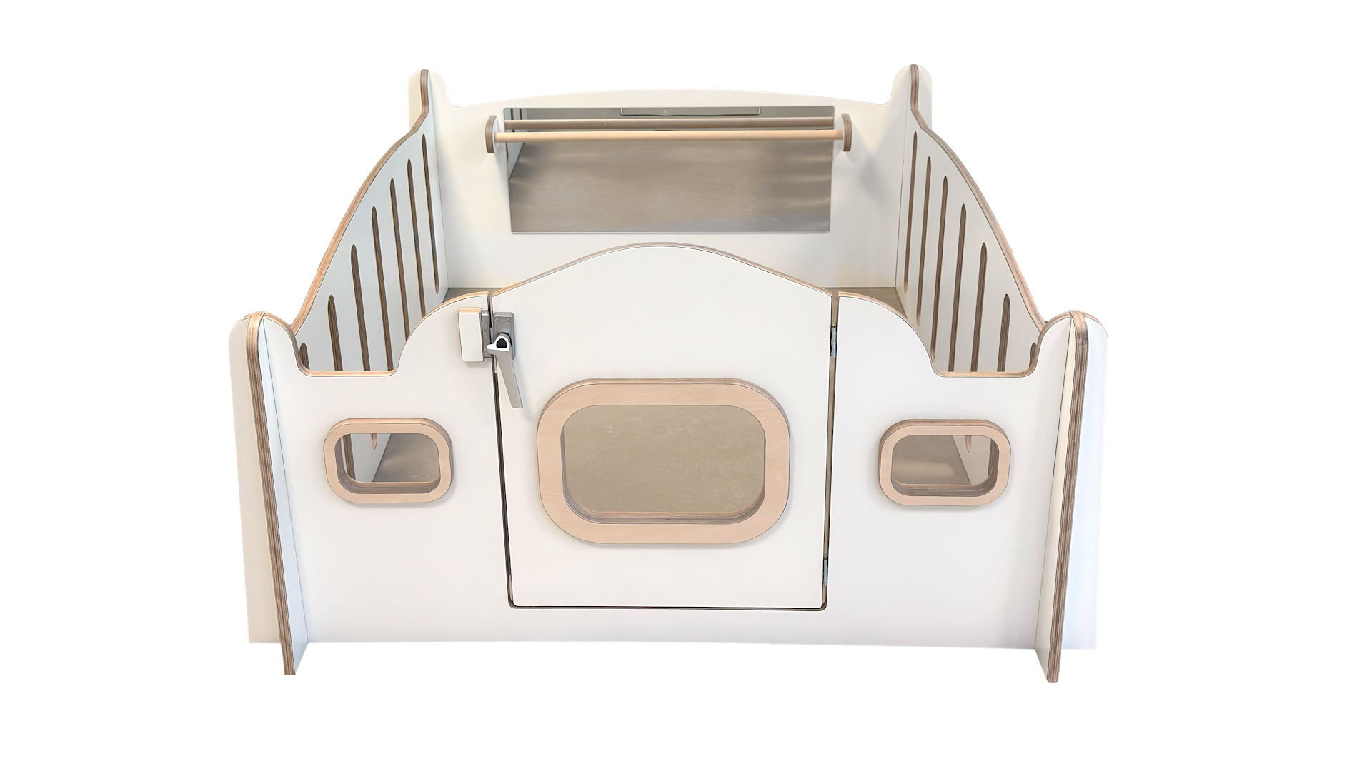 Uitgevoerd in berken multiplex met witte HPL toplaag.