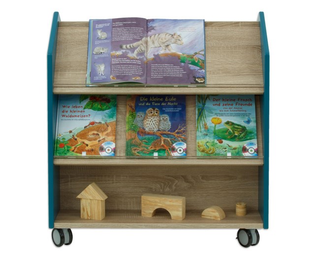 De fraai vormgegeven draaibibliotheek kan aan beide zijden worden gebruikt. Aan de voorzijde bevinden zich twee opbergvakken waarop de boeken kunnen worden gepresenteerd. Op kindvriendelijke hoogte kunnen de kinderen naar de boeken kijken. De hellende plank vormt een bureau waarop de kinderen door de boeken kunnen bladeren. Aan de achterkant bieden drie planken ruimte voor tal van boeken. Alle wielen zijn vergrendelbaar, wat voor een stevige basis zorgt. Dankzij de wielen kan de boekenwagen gemakkelijk door de kamer worden geduwd.
