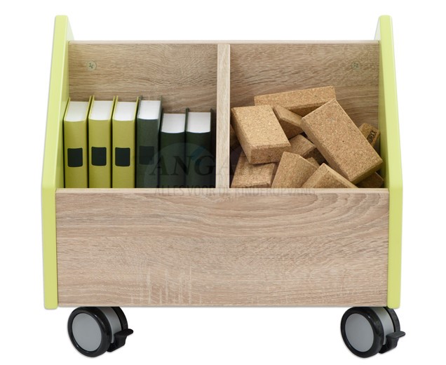 Er zijn veel boeken in drie gedeelde vakken. De kinderen kunnen hun boeken zelf verwijderen en terug plaatsen. De mobiele boekenkast is verkrijgbaar in wit, lime en petrol.