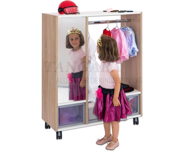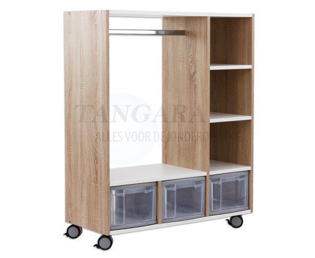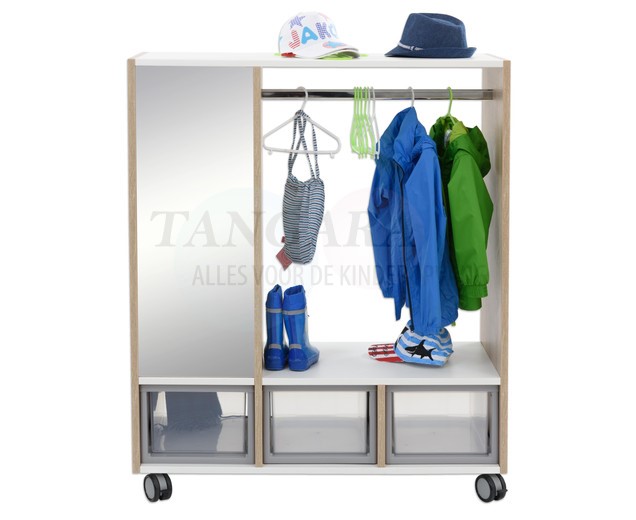 Veel opbergruimte en ruimte voor jassen biedt deze garderobe. De 4 wielen zijn vergrendelbaar, zodat de kledingkast een stabiele grip heeft. De flexibele kast kan eenvoudig en snel worden verplaatst, waardoor het een geweldige manier is om kamers snel en eenvoudig opnieuw in te richten. De kledingkast is aan twee zijden te gebruiken. Aan de ene kant is een boogglazen spiegel verwerkt, aan de andere kant bieden compartimenten ruimte voor tassen, sjaals en meer. Dit product wordt ongemonteerd geleverd en hierop is zelfmontage van toepassing.. |