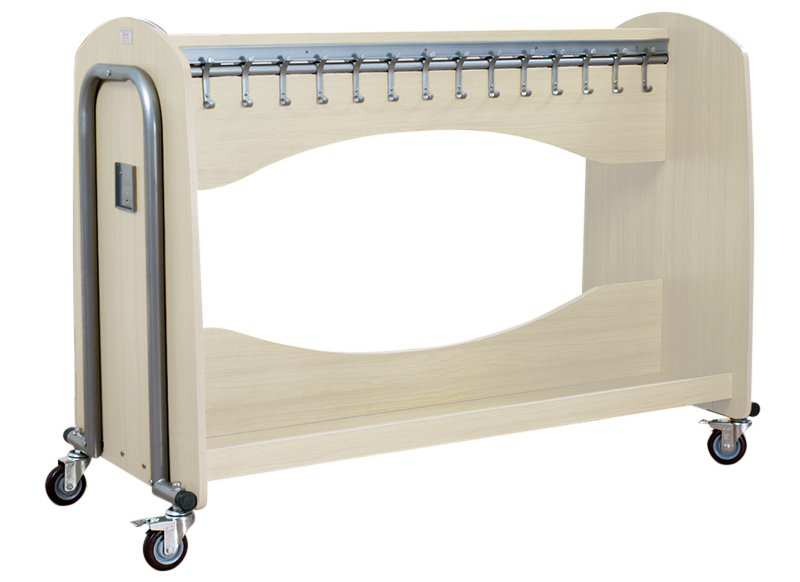 Omschrijving: Vestiairemeubel met aan beide zijden 28 kapstokken. Legplank onderaan voor het plaatsen van tassen.