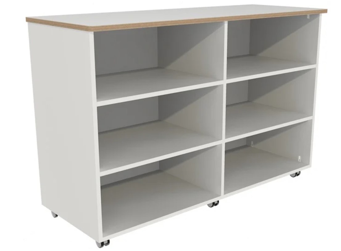Lage flex-kast met 6 grote opbergvakken, voorzien van stevige geremde wielen.