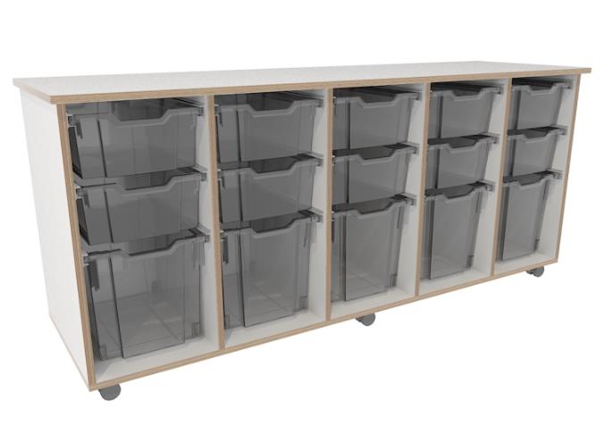 Verrijdbare lage kast met maar liefst 10 medium transparante bakken H15 cm