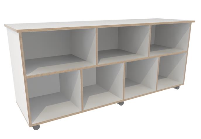 Verrijdbare lage kast met maar speelse vakjes.