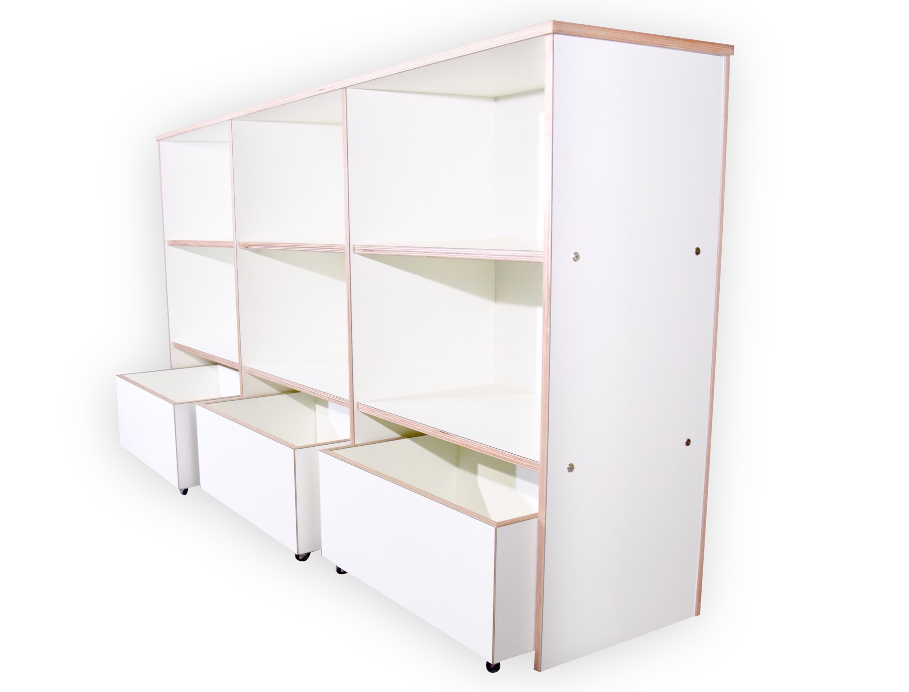 Deze kast is opgebouwd uit 18 mm berken multiplex met HPL toplaag in de kleur wit.
