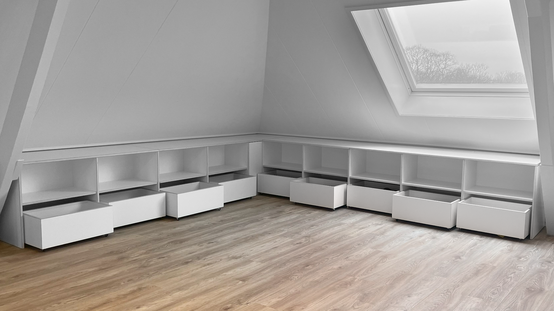 Deze kast is opgebouwd uit 18 mm berken multiplex met HPL toplaag in de kleur wit.