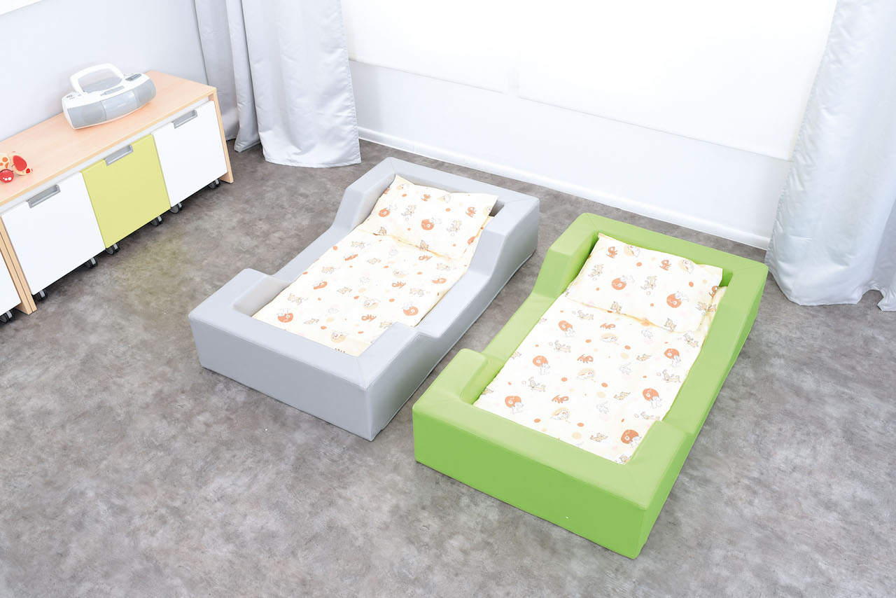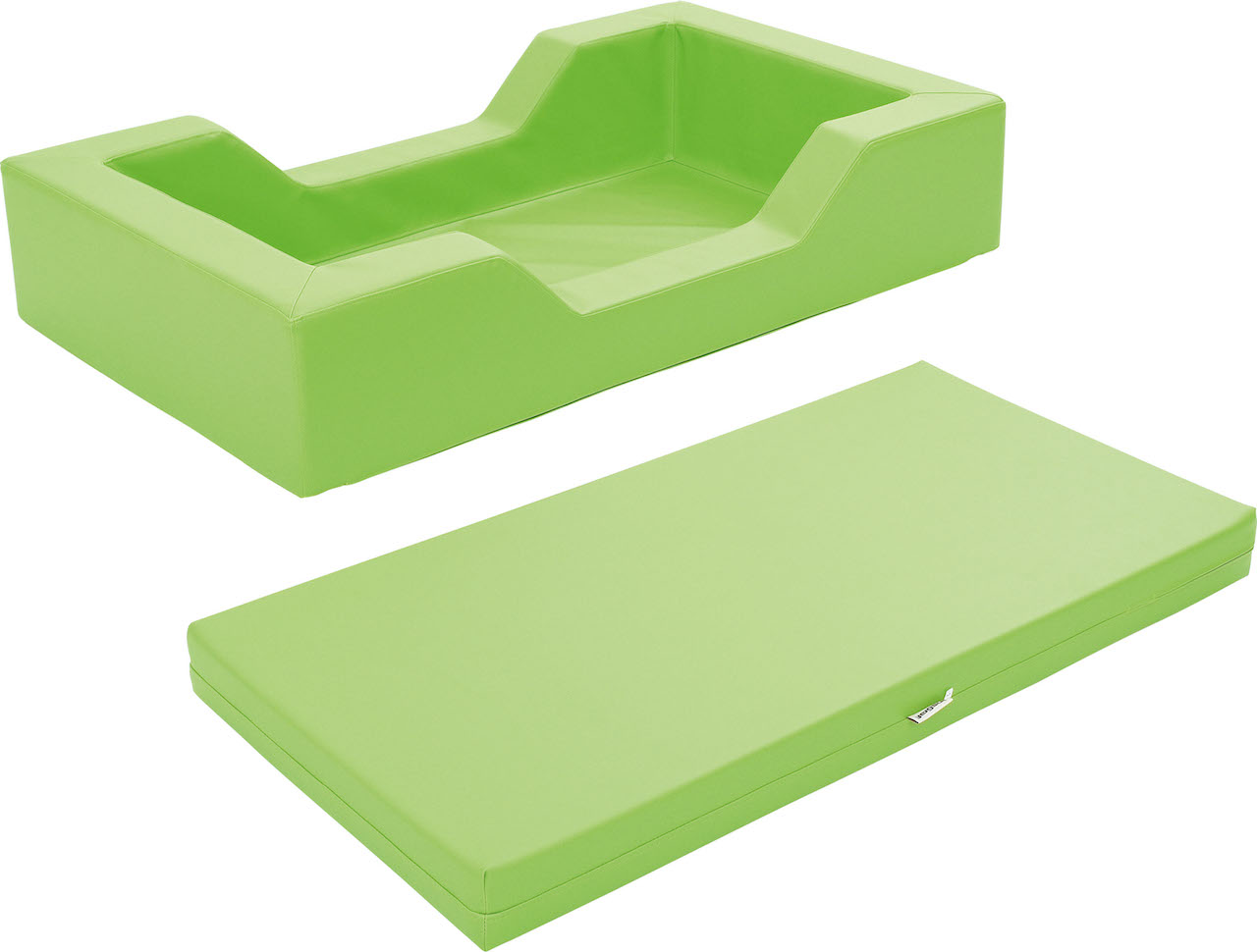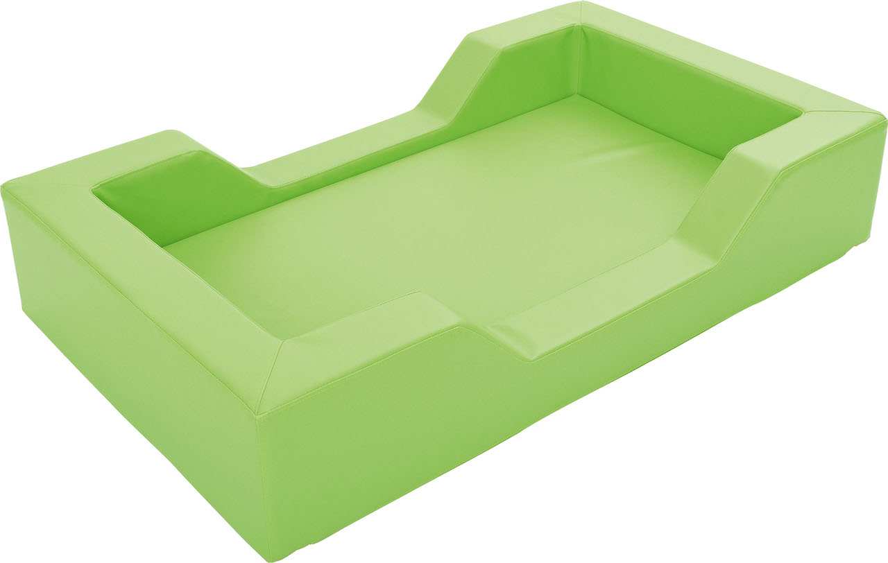 Kleurrijk kinderbed van hardschuim bedekt met duurzaam PVC-materiaal, gemakkelijk schoon te maken en bestand tegen vocht. De stof bevat geen ftalaten.