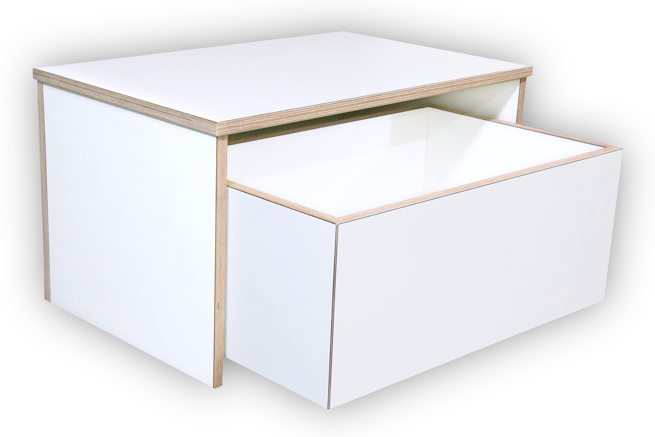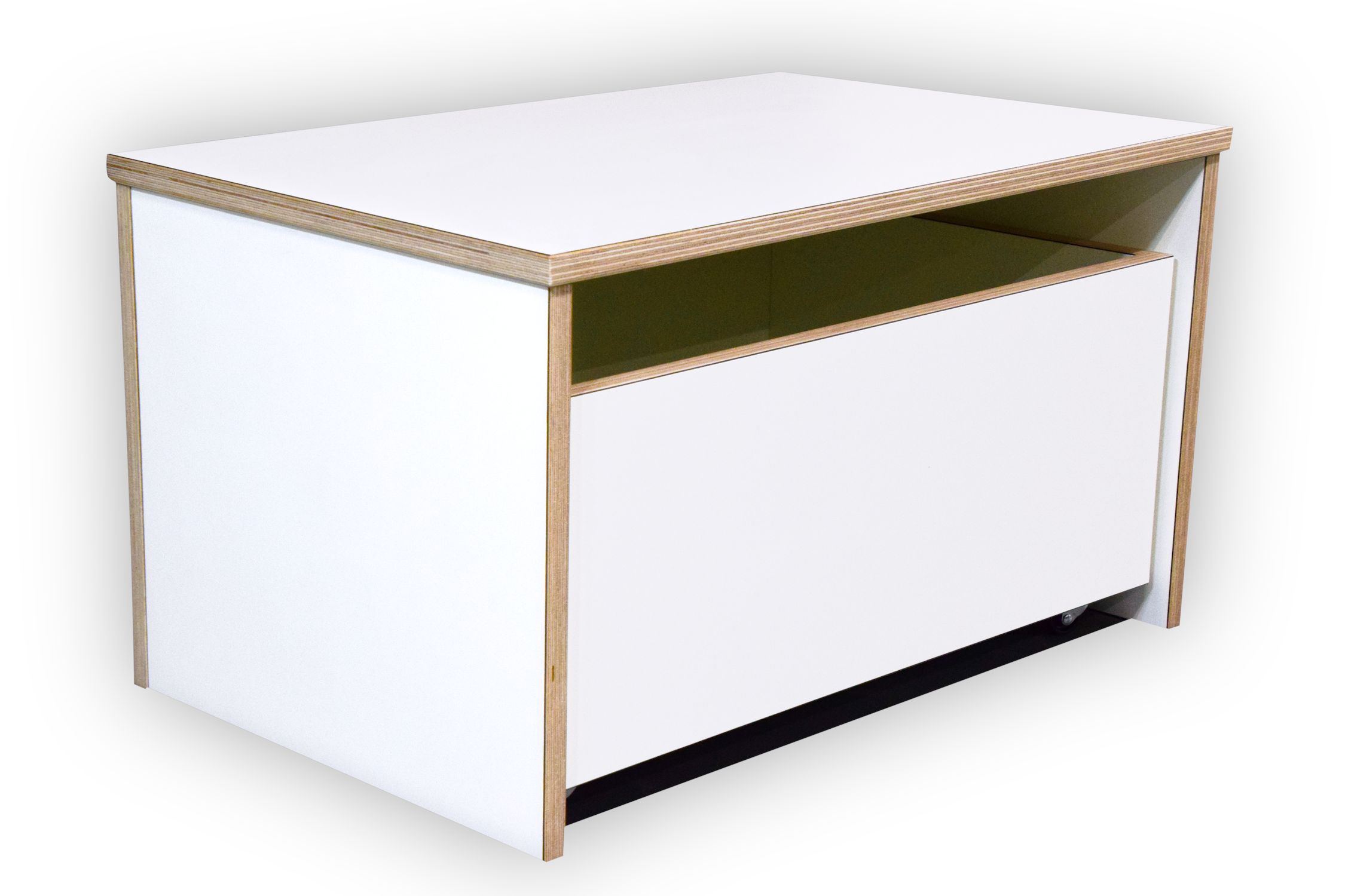 De bank en rolbakken zijn opgebouwd uit 18 mm berken multiplex met witte HPL toplaag.