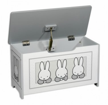 Zilvergrijze speelgoedkist met deksel en opbergmogelijkheden.
