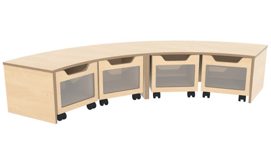 Opbergbank kwartrond met 4 rolbakken Berken