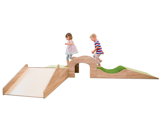 | Het ultieme speelparadijs voor je interieur aangename kleurencombinatie verschillende bedekkingen met educatieve toegevoegde waarde Avonturenlandschap in frisse, vriendelijke kleuren Parcoursset David in het decor eiken en de bekleding in harmonieuze, frisse kleuren, brengt nieuwe wind in uw interieur. De set is ongelooflijk duurzaam en past wonderwel in je dagelijkse leven in de kinderopvang. Dankzij de bevestigde antisliprand zijn alle elementen veilig en kunnen ze niet van hun plaats glijden. De sokkels kunnen zonder schroeven en clips en kunnen daarom flexibel worden herschikt. Elementen ontdekken en ontwikkeling bevorderen Deze set bestaat uit puur avontuur. Een bijzonder hoogtepunt is de tunnel. Hier hebben kinderen een speciale leuke balans en bevorderen ze hun evenwichtsgevoel aan de zijkant. De tunnel is ook ideaal om te kruipen en terug te trekken. Volgens uw behoeften De set David wordt in een kleurencombinatie bij je geleverd - je kunt de podiums zo instellen als je wilt. Natuurlijk kun je op elk moment iets toevoegen aan andere podiumelementen uit ons uitgebreide assortiment. Opmerken: De elementen zijn exclusief ontwikkeld voor gebruik door baby- en kleuterkinderen (0-6 jaar). Daarom is het maximale laadvermogen 120 kg per element. Hoogwaardige materialen - ideaal voor kinderen! De verschillende oppervlakken van de sokkel bevorderen de perceptie en de motoriek van de kinderen en stimuleren de tactiele en visuele zin. Bovendien hebben alle materialen geweldige eigenschappen, waardoor ze bijzonder aantrekkelijk zijn voor gebruik in kinderopvang. Deze set heeft verschillende hoogwaardige rubbers: TRETFORD-tapijt bestaat voor 80% uit geitenhaar en voor 20% uit scheerwol. De natuurlijke materialen maken het bijzonder klimaatregulerend en gezondheidsbeschermend. Bovendien is het antistatisch, stofbindend en duurzaam, evenals vlamvertragend. Linoleum is gemaakt van hernieuwbare grondstoffen. Hij is ook antistatisch en bovendien erg stil. Het oppervlak is antibacterieel en kan perfect worden gereinigd. Het kunstgrasoppervlak geeft de set een authentieke uitstraling met zijn echte uiterlijk. Dit zorgt voor een natuurlijke spelervaring. levering 1x sokkel - oprit, eiken decor, 0-24 cm, linoleumkalk, (hxbxd) 0 / 24x75x75 cm 1x sokkel - goot decor eiken, 24 cm, gras, (hxbxd) 24x75x75 cm 1x sokkel - tunnel, eiken decor, (hxbxd) 56x75x75 cm 1x sokkel - vierkant, eiken decor, 24 cm, linoleum, (hxbxd) 24x75x75 cm 1x sokkel - overgangshelling, eiken decor, 24-36 cm, bruin tapijt, (hxbxd) 24 / 36x75x75 cm 1x sokkel, eiken decor, (hxbxd) 44x75x75 cm Gegevens en feiten te gebruiken: Aanbevolen leeftijd: 3-6 jaar textuur: Materiaal: Hout Afmetingen / gewicht: Gewicht incl. Verpakking: 94 kg. |