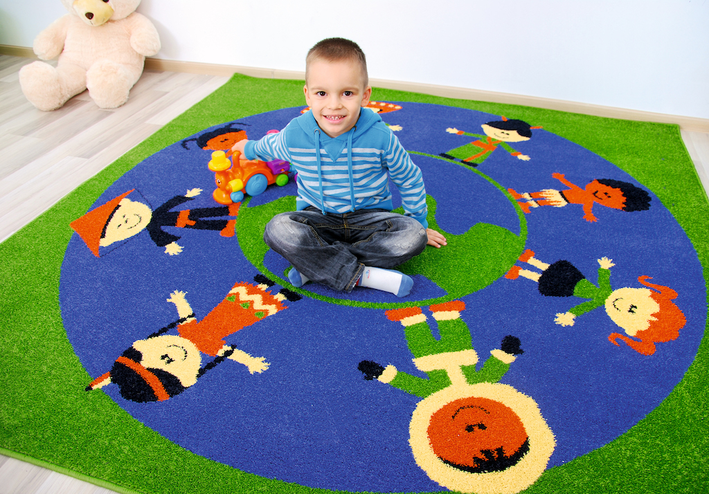 De cirkel gevormd door de personages op het tapijt kan een plek zijn waar kinderen omheen zitten.