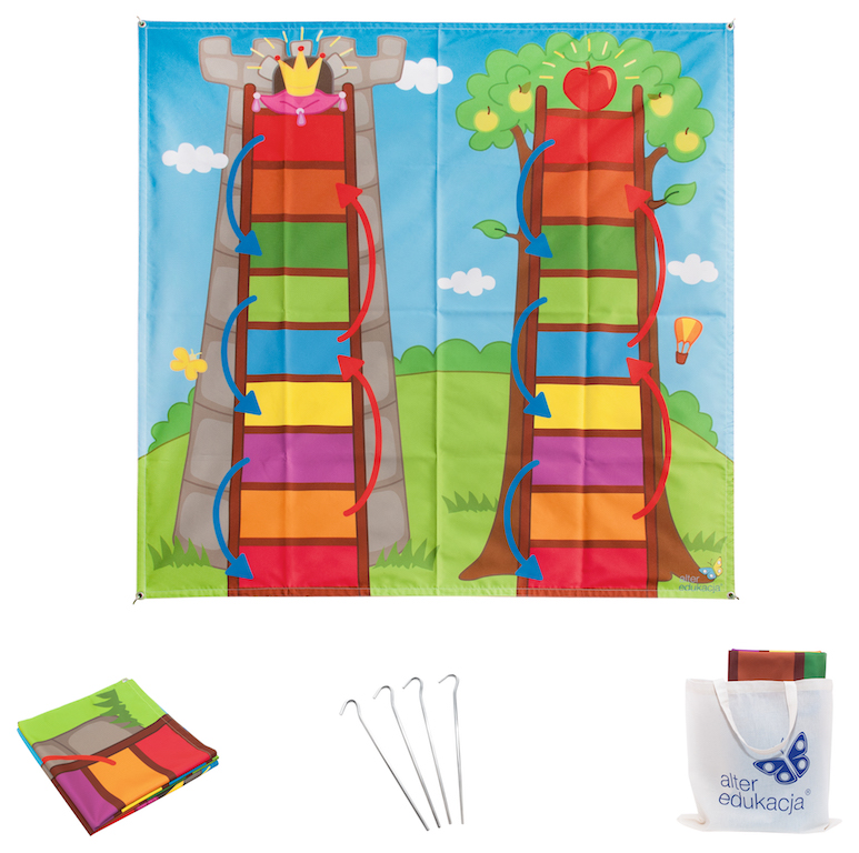 Dankzij de stalen pinnen die aan de set zijn bevestigd en de speciale gaten in het kleed, kan het stevig aan de buitenkant worden bevestigd, bijvoorbeeld op het gras.