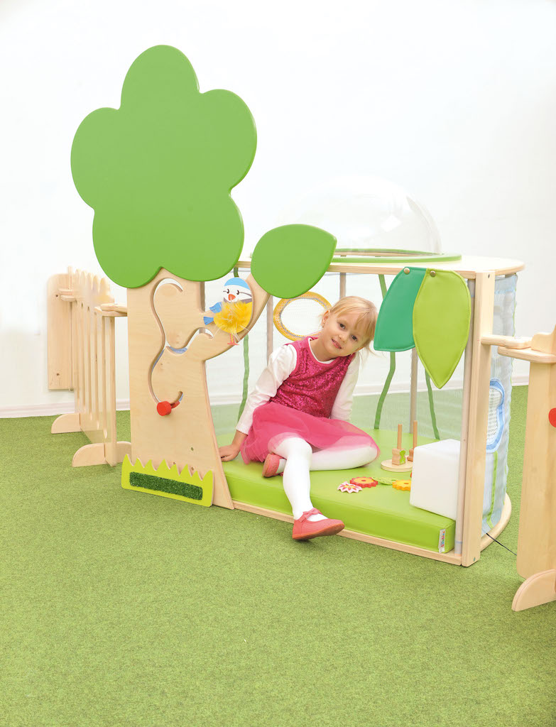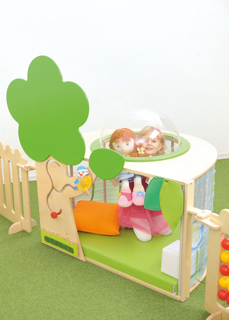 Het snoezelbos kan aan de scheidingspaneeltjes geschakeld worden maarkan ook op zichzelf functioneren.