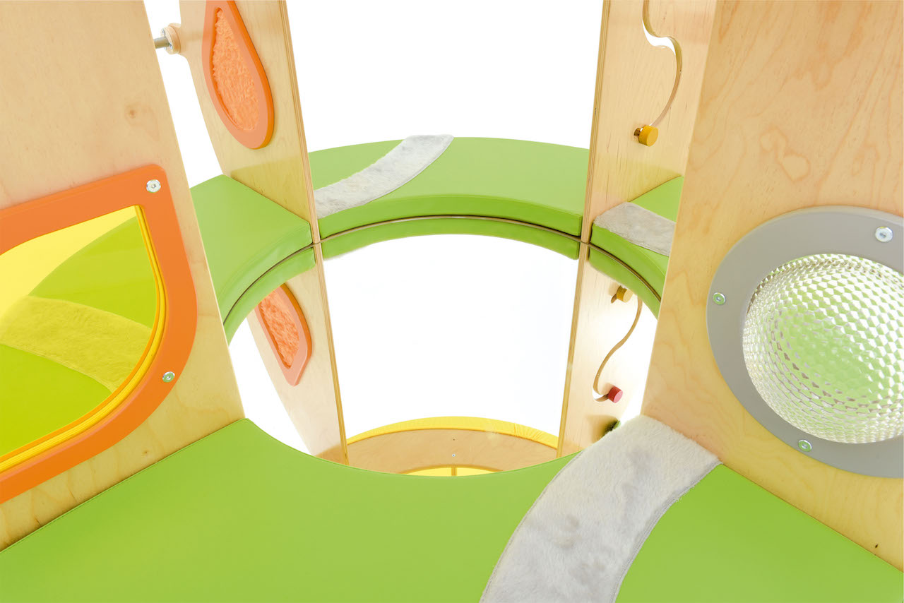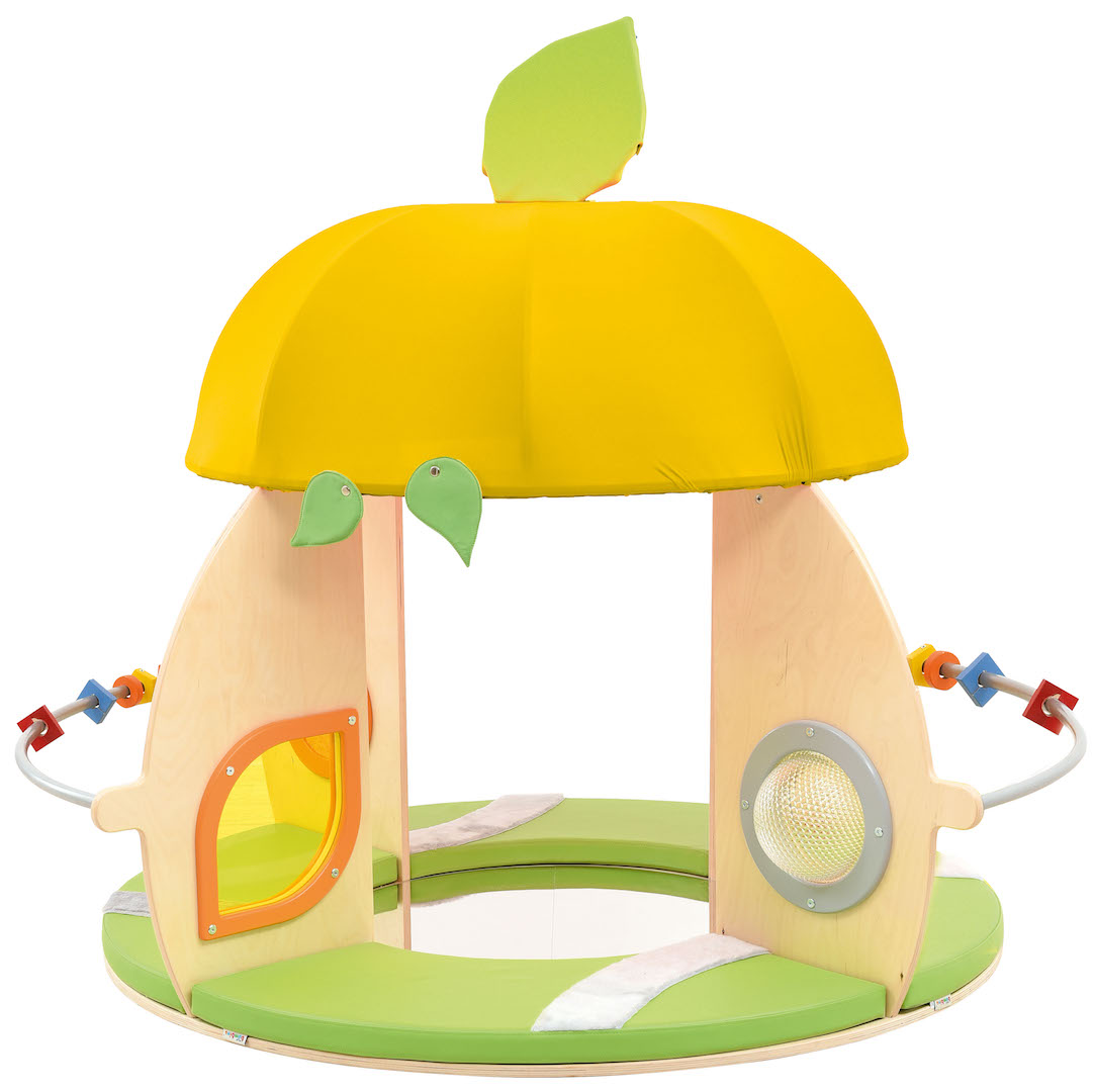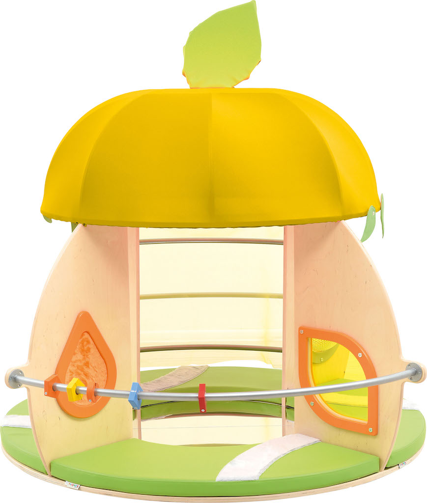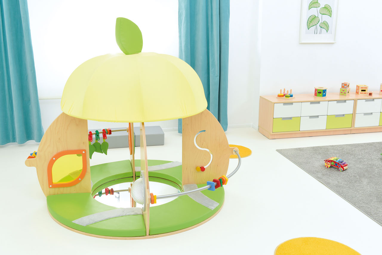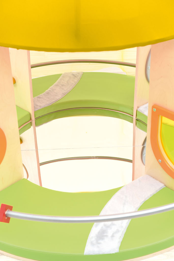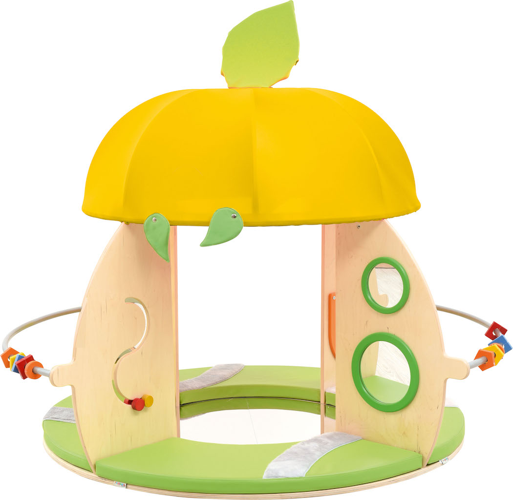 Een rond huisje met een dak, matrassen en een spiegel op de vloer.