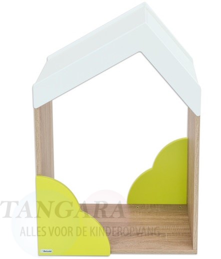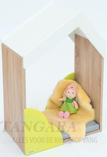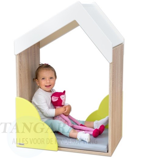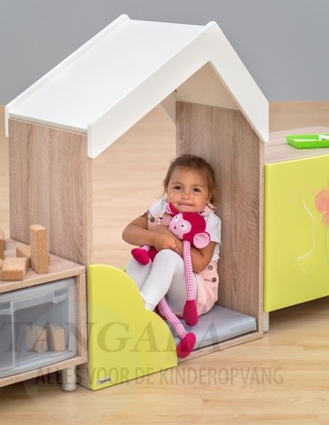 De struiken aan de zijkant van het huis, maar ook het dak sluiten het huis en geven het kind zo zijn eigen ruimte om zich goed te voelen.