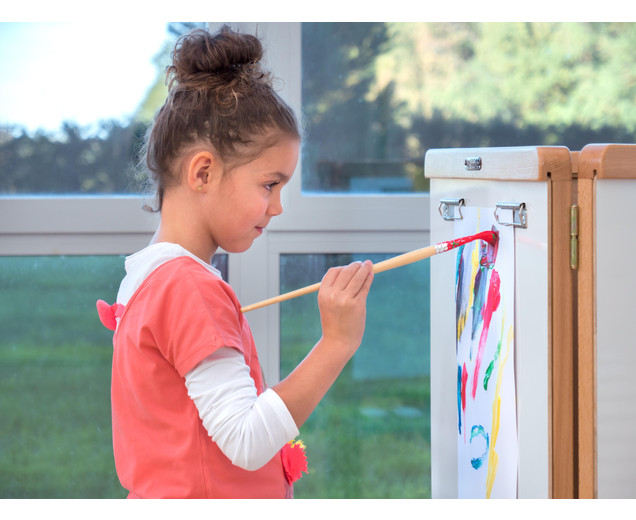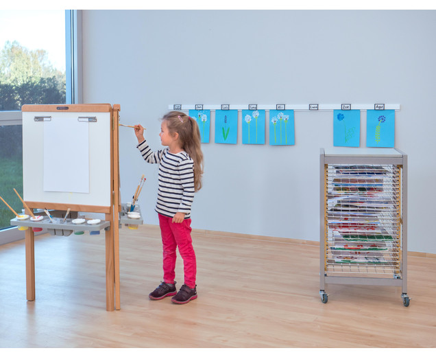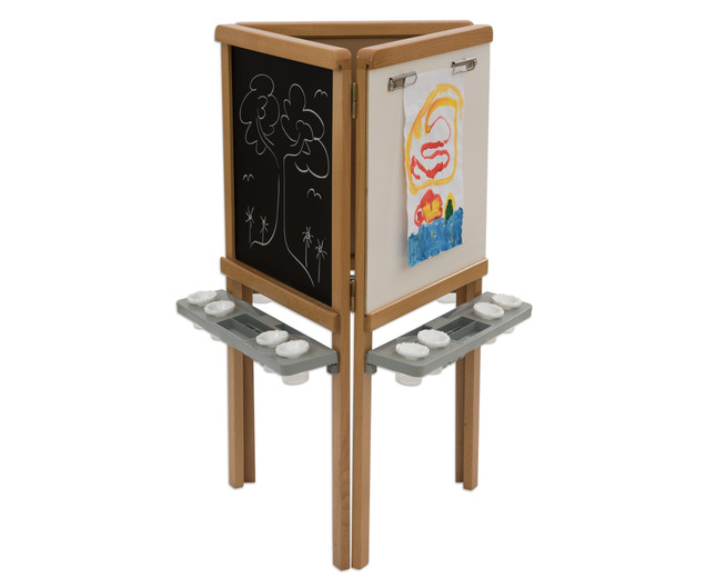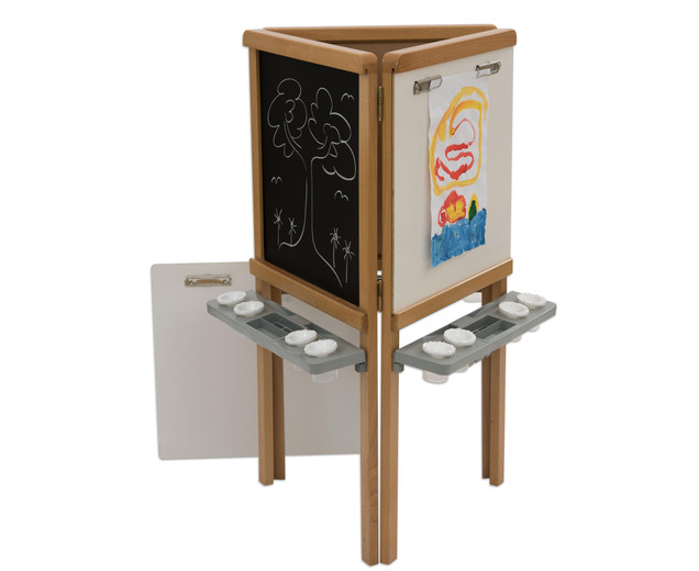 | 3-zijdige schildermuur van hout voor drie kinderen met afneembare lade Whiteboard, schoolbord en schildermuur Klem het papier vast - klaar! Dit model is gewoon ingenieus en super doordacht - de 3-zijdige schildermuur is bij uitstek geschikt voor kinderen tussen 3 en 10 jaar. Drie kinderen kunnen tegelijkertijd creatief worden op een werkhoogte van 55 cm. Door de verschillende oppervlakken, zoals whiteboard en magnetisch bordoppervlak , kunnen kinderen ervaring opdoen met verschillende soorten applicatietools (idealiter krijtbord- en whiteboardmarkers) en creatief worden op papier met vingerverf op een oppervlak van ongeveer 60 x 60 cm . Metalen connectoren verbinden eenvoudig de drie zijden met elkaar. Het whiteboard-paneel kan door de schuifstrip uit het frame worden verwijderd en heeft 2 aansluitstrips per oppervlak voor het bevestigen van papier . Het praktische dienblad kan worden verwijderd en in de vaatwasser worden gereinigd. Het wordt gebruikt om 4 verfpotten op te slaan incl. Dop , borstels, pennen en meer Details: Afmetingen (H x B x D): 15 x 60 x 60 cm Materiaal: hout, MDF, kunststof Gewicht: 18 kg Hoogte onderrand Verfoppervlak: 55 cm levering - 3-zijdige schildermuur - 3 kleurenladen - 12 kleurenbekers met dop - Montage- instructies - Bevestigingsmateriaal Gegevens & feiten te gebruiken: Leeftijd vanaf:3 jaar textuur: Primair materiaal:houtAndere materialen:Kunststof, metaal, MDF Afmetingen / gewicht: diepte:60 cmbreedte:60 cmheight:115 cm |