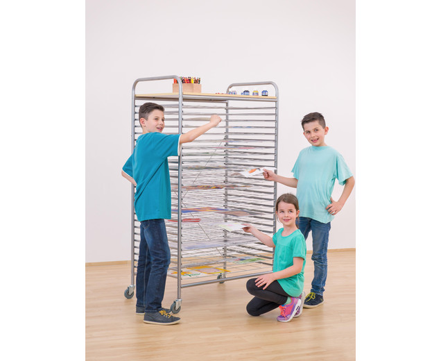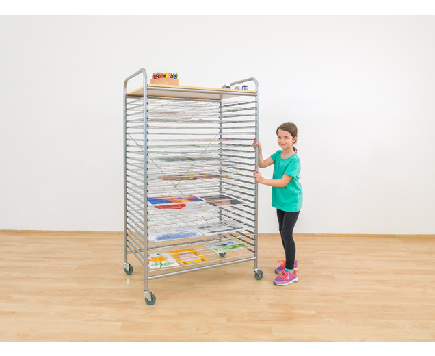 Op de grote Betzold foto-droogwagen kun je veel natte foto's drogen zonder te verdwalen en zonder naar beneden te glijden. De Betzold-droogkar voor afbeeldingen is uitgerust met 25 droogroosters, die met geleiderails aan de zijkanten gemakkelijk in en uit kunnen worden geschoven. De afzonderlijke rasters bieden ruimte voor foto's tot het formaat DIN A1. Hierdoor kan de auto tegelijkertijd tot 100 A4-formaat afbeeldingen drogen.