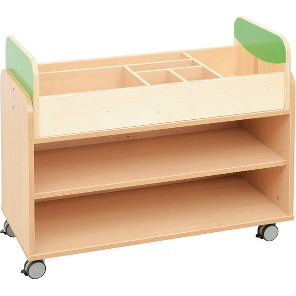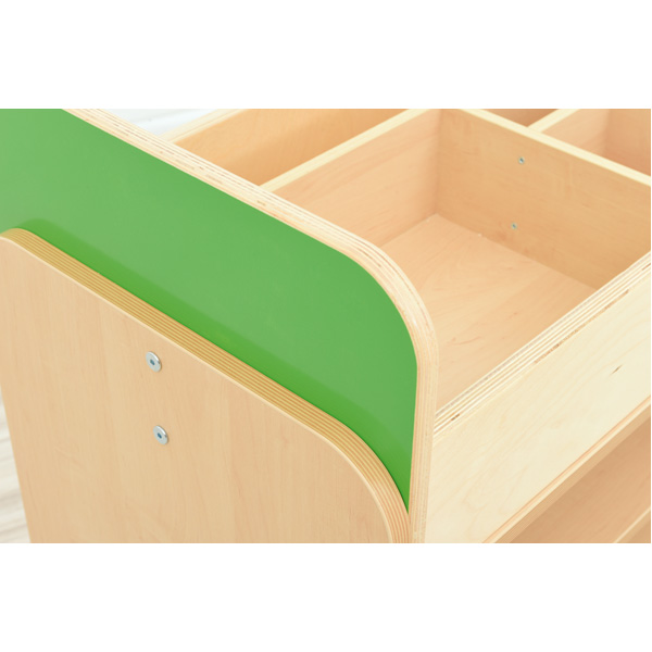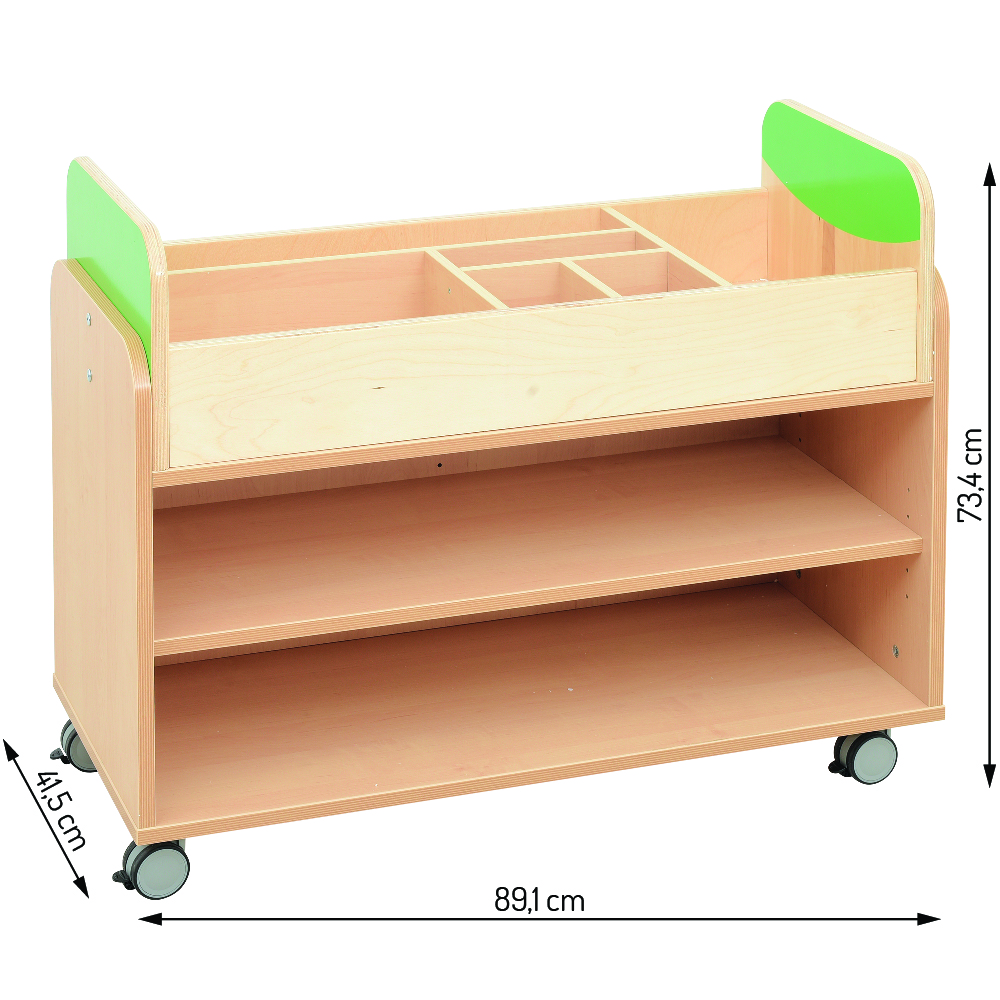 Verrijdbare kast gemaakt van gelamineerd spaanplaat met een dikte van 18 mm, in berken tinten met een multiplex ABS-rand. ? afmetingen 89,1 x 41,5 x 73,4 cm Aan de bovenzijde is deze kast uitgerust met compartimenten voor het opbergen van blokken, klein speelgoed en andere kleine voorwerpen. ? afmetingen 85 x 40,9 x 25 cm