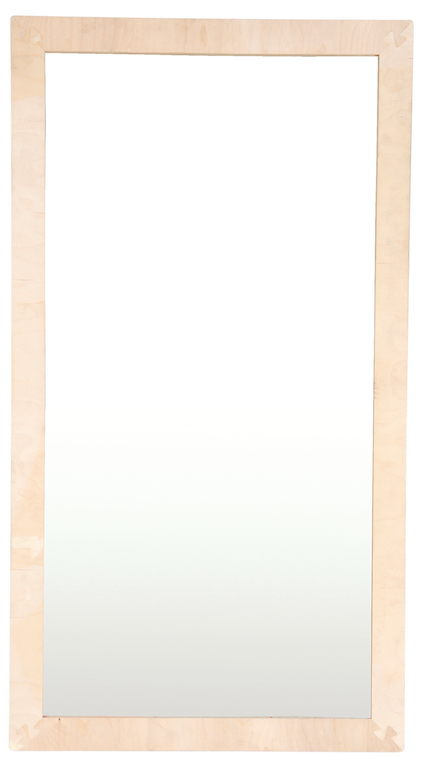 Spiegel met houten lijst, voorzien van veiligheidsglas..