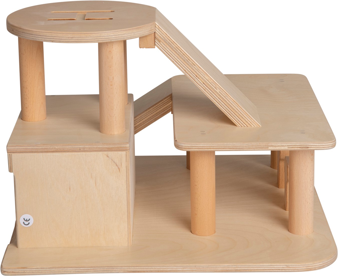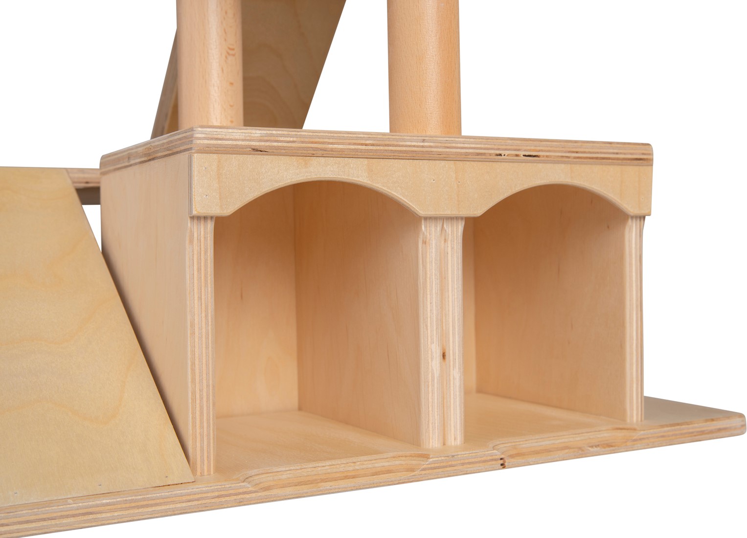 De twee ruime garage openingen leren de kinderen auto's te parkeren, wat de motoriek ten goede komt.