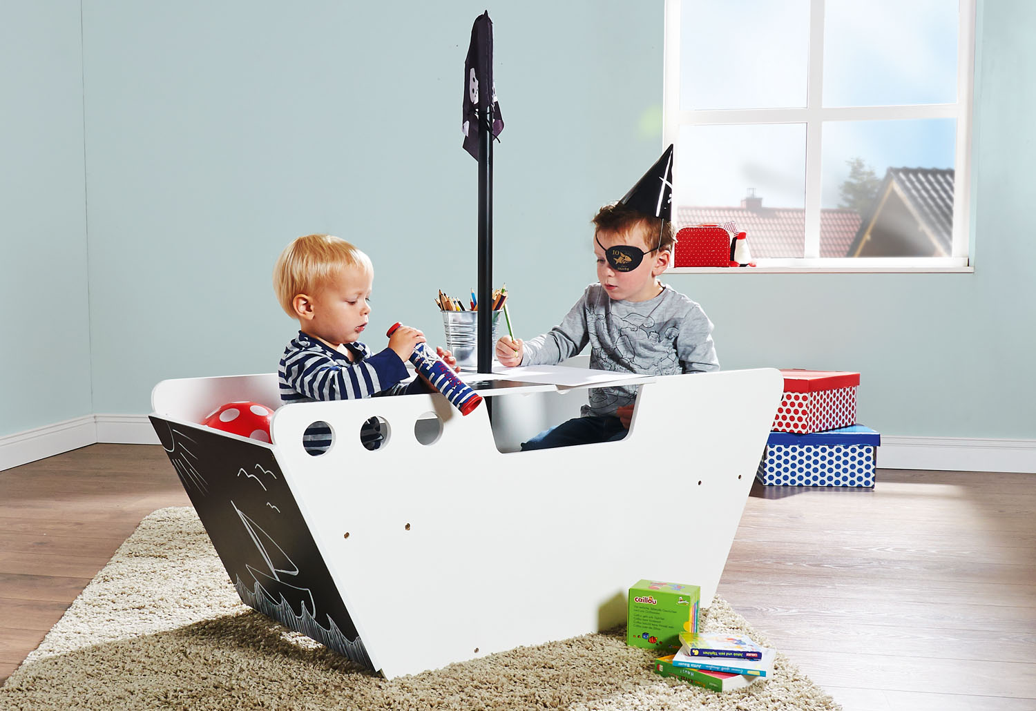 | Speelschip Captain Jack Ahoy matrozen! Dit speelschip Captain Jack is veel meer dan alleen een piratenschip: het is tevens een kinderzitje, tekentafel en opbergdoos. Hierin beleven kleine piraten en zeilers grote avonturen op volle zee; met hun beste vriend, beste vriendin of broers en zussen, koersen de zeilen naar een spannende & avontuurlijke reis. Het tafelblad en de zijpanelen zijn zwart gelakt en kunnen als krijtbord gebruikt worden. Hoge kwaliteit: MDF wit, zwart. Afmetingen: L 121 cm, B 50 cm, H 120 cm; Gewicht: 18 kg. Inhoud: speelschip met vlaggenmast en piratenvlag. Aanbevolen voor kinderen van 2 tot 7 jaar oud. |