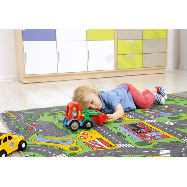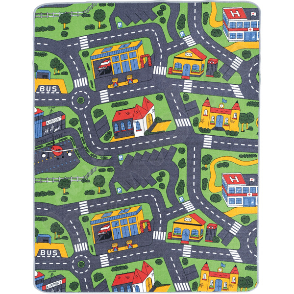 Een vloerkleed waarop elk kind zijn favoriete spellen kan overzetten in de wereld van een echte straat en elk hoekje en gaatje van hun stad kan verkennen.