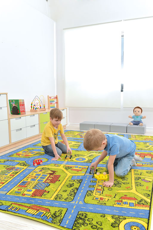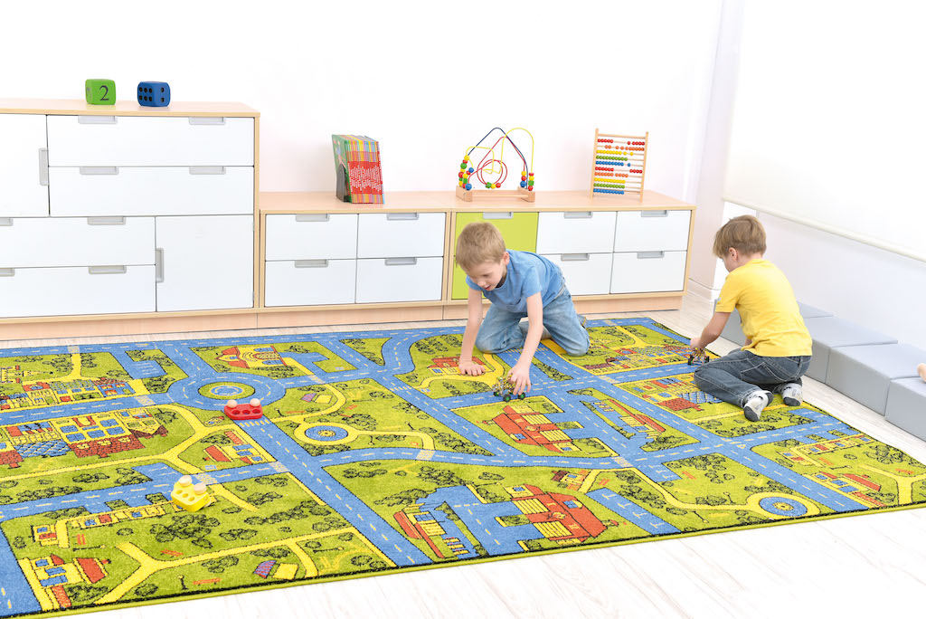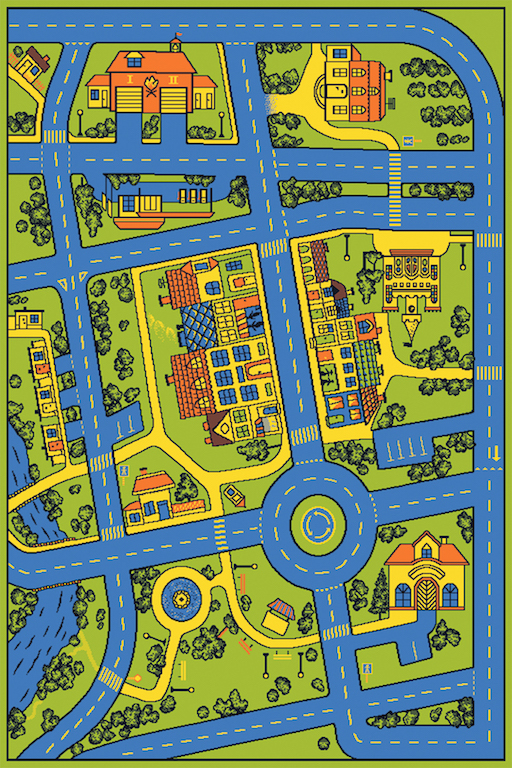 Een vloerkleed van fleece materiaal met een stad en straten print.