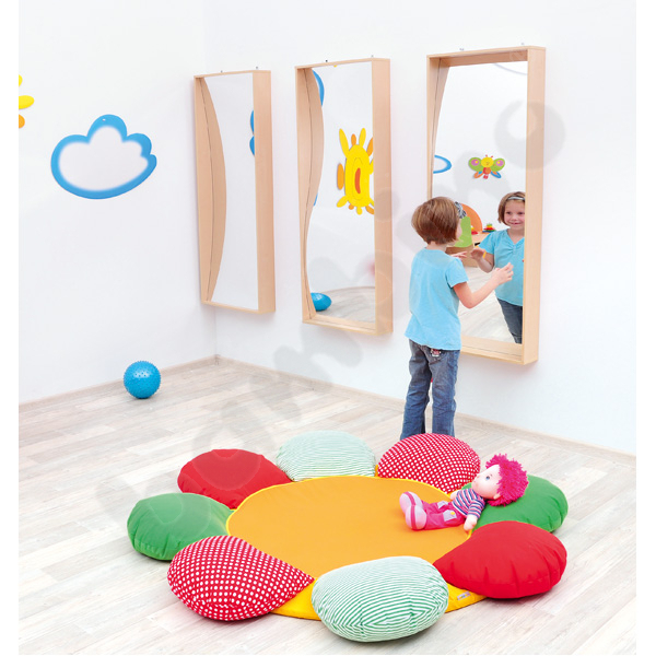 Kinderen kunnen grappige gezichten maken en de vervormde weerspiegeling van hun figuur erin observeren.