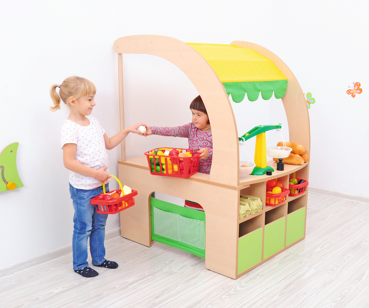 Winkel met veel uitstalmogelijkheden en een leuk stoffen dakje.